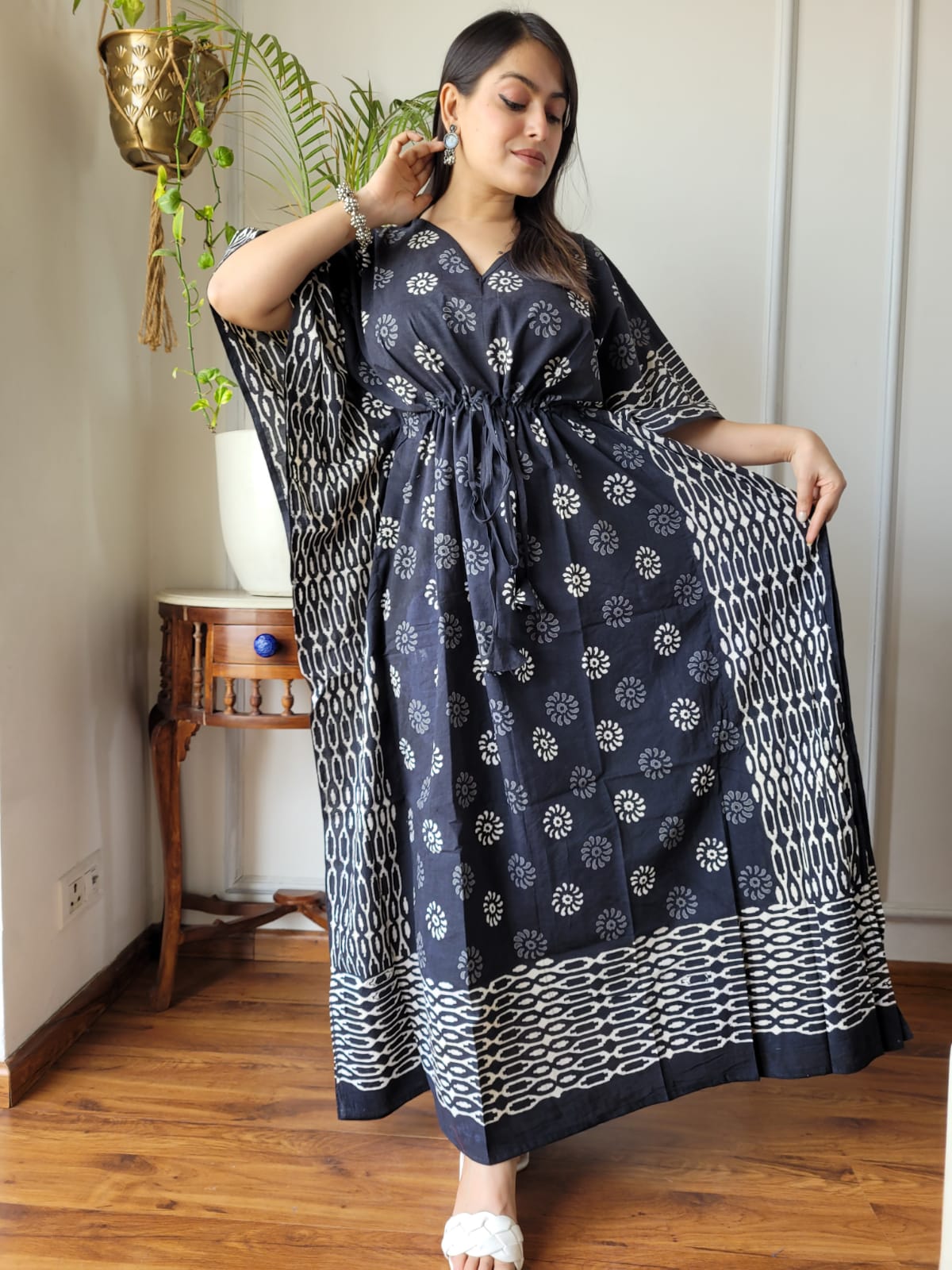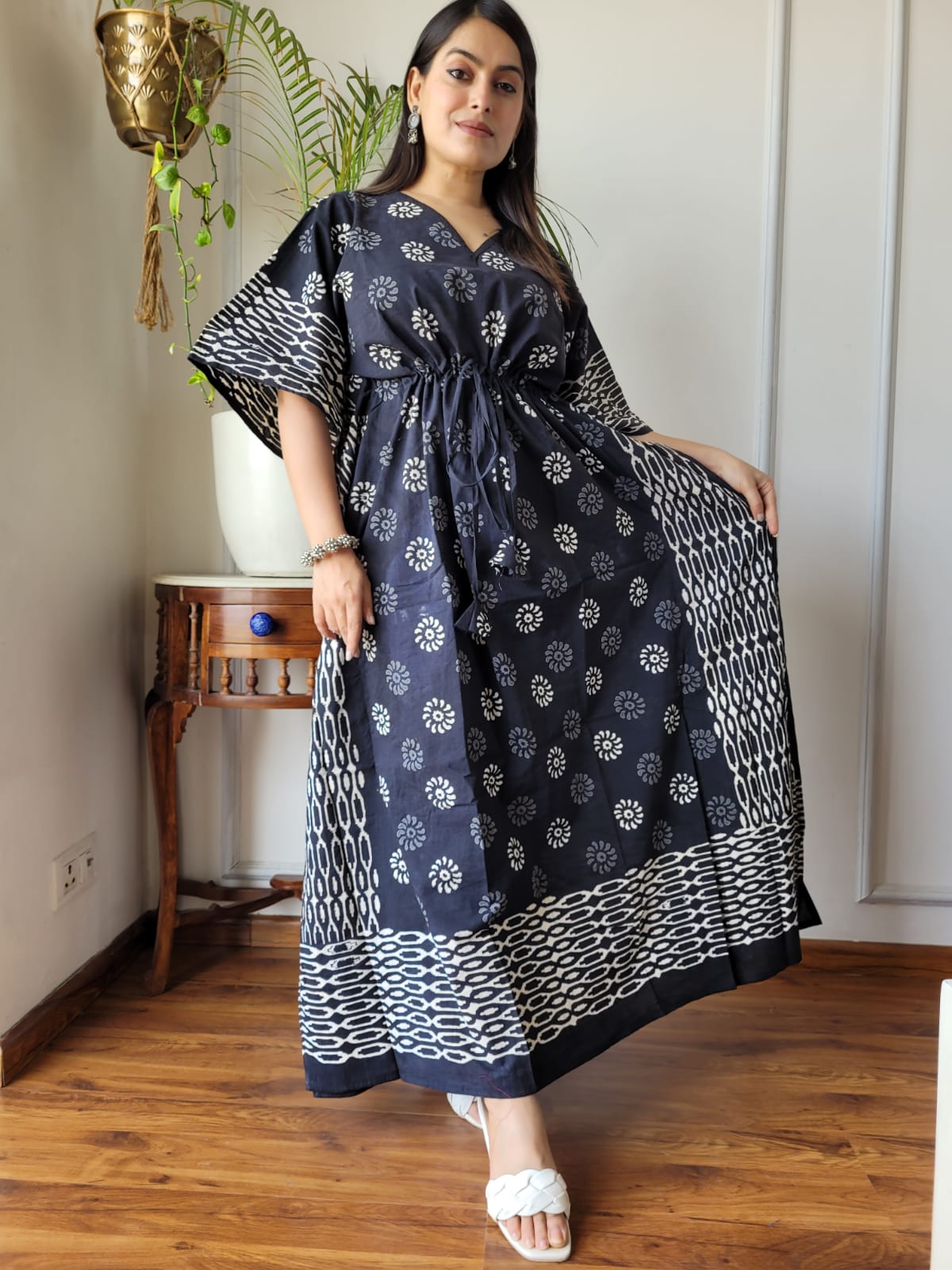 Step into timeless elegance with this Black and White Hand-Block Printed Kaftan. With delicate floral motifs and bold geometric borders, this kaftan is a perfect mix of tradition and contemporary style.