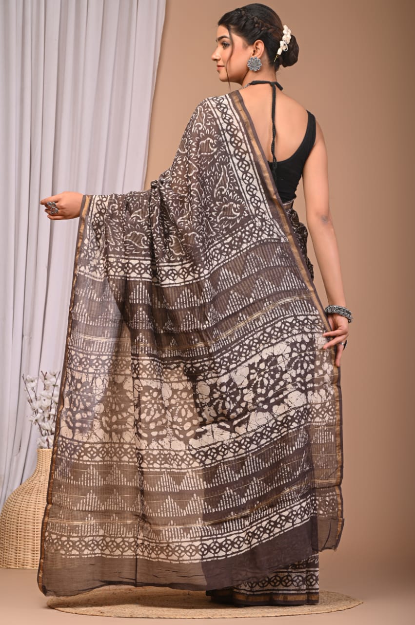 Channel your love for tradition with this Black and Beige Chanderi Silk Saree, a graceful blend of natural tones and heritage design. Inspired by Dabu hand block prints, the saree features intricate motifs and geometric patterns that reflect rustic charm and artisanal craftsmanship.