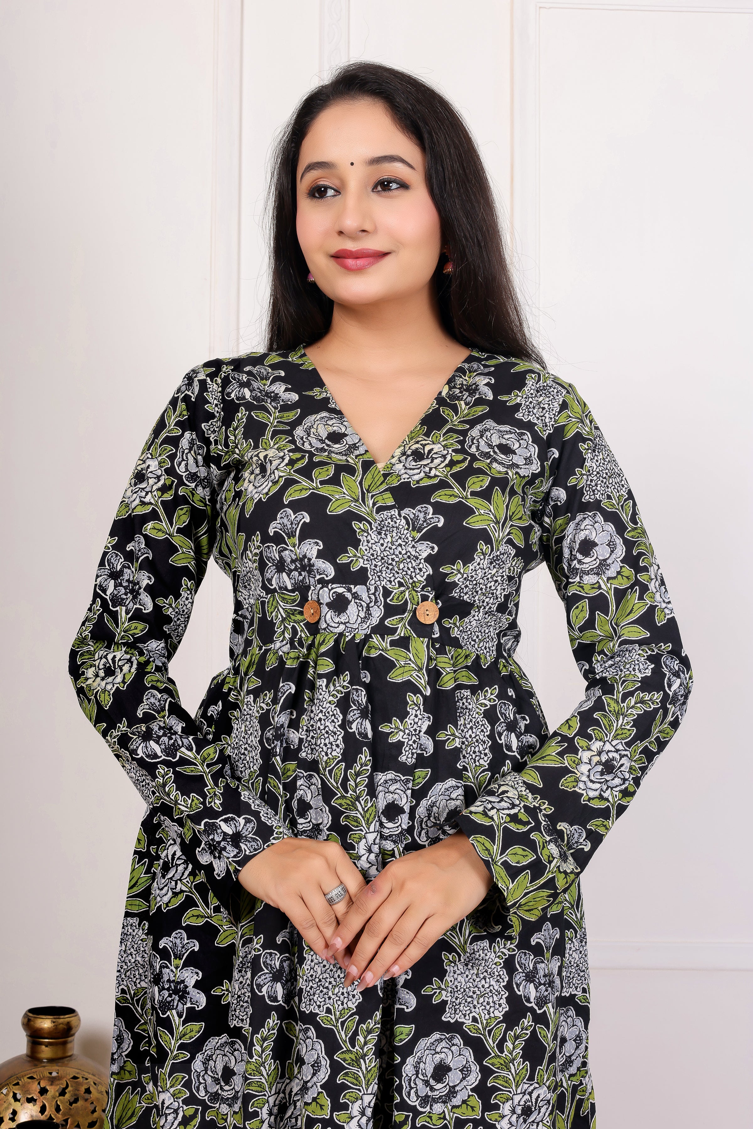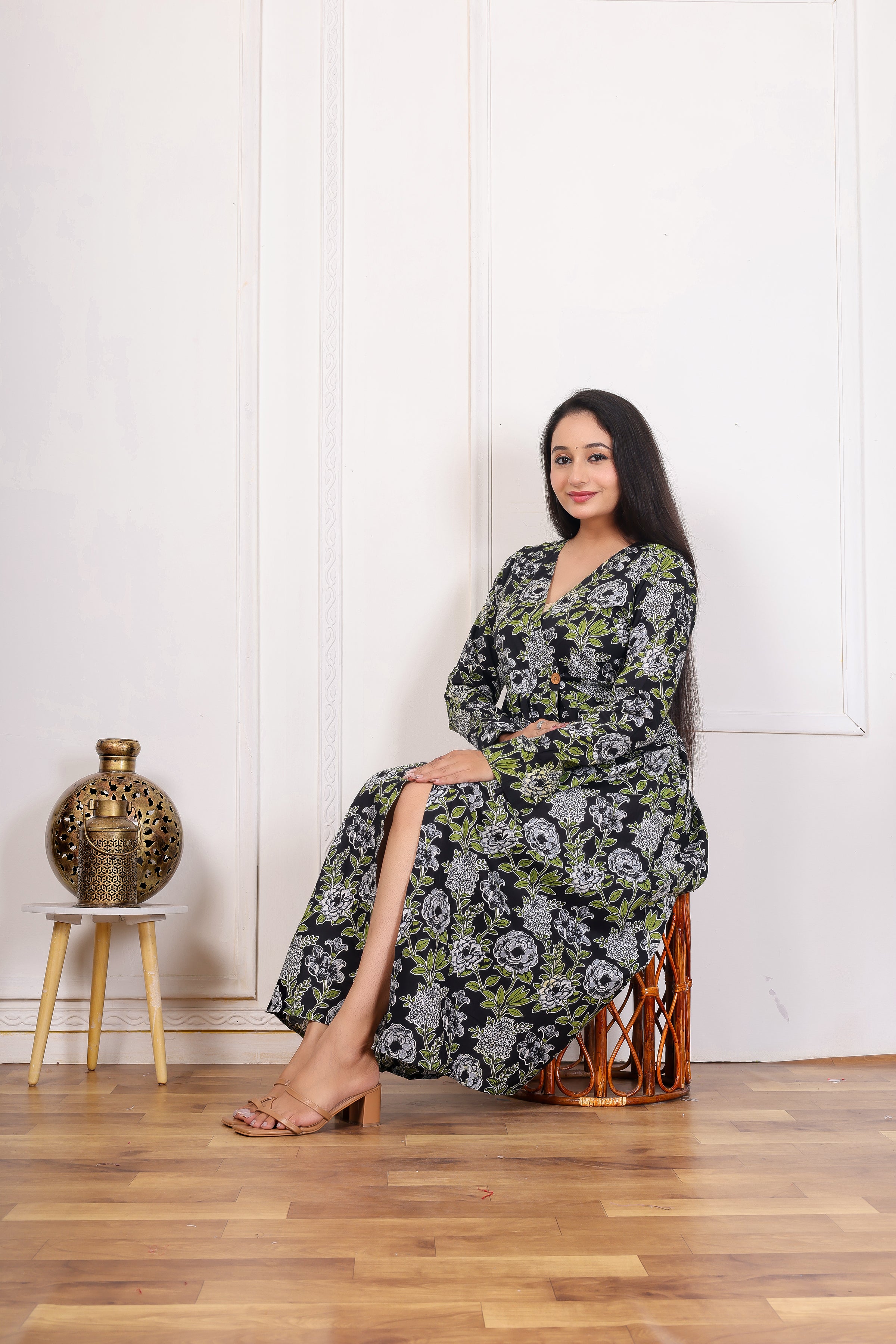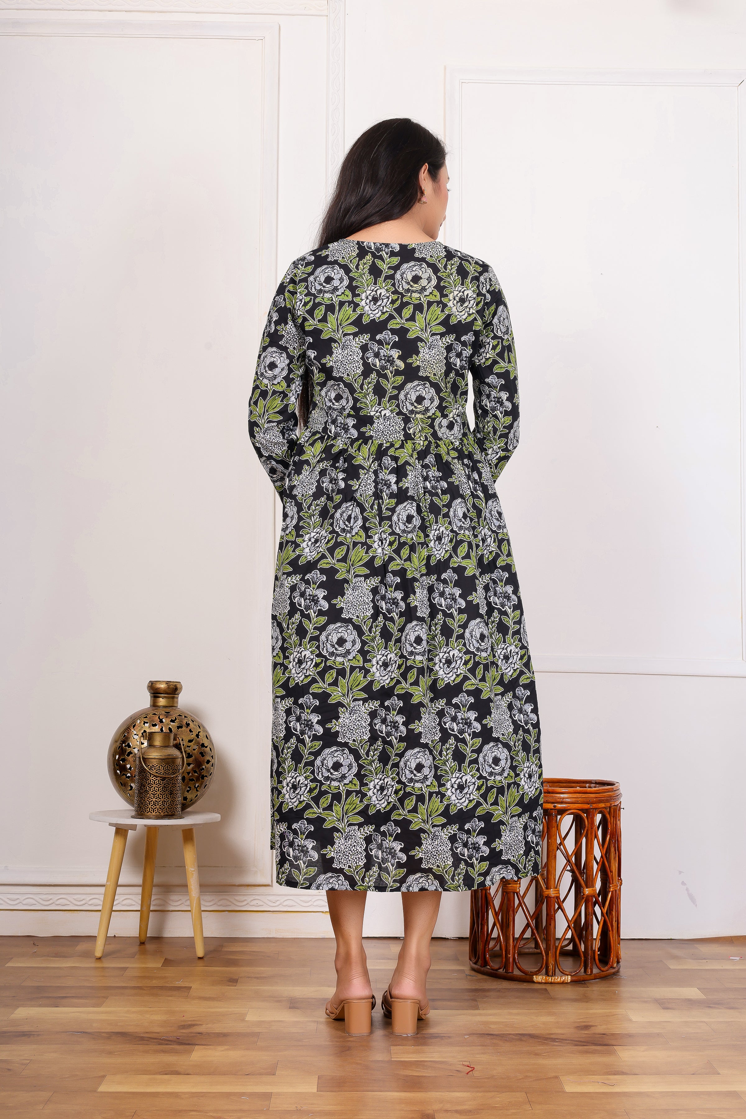 Make a bold yet graceful statement with our Black Floral Printed Midi Dress, designed for women who love timeless elegance with a touch of vibrance.