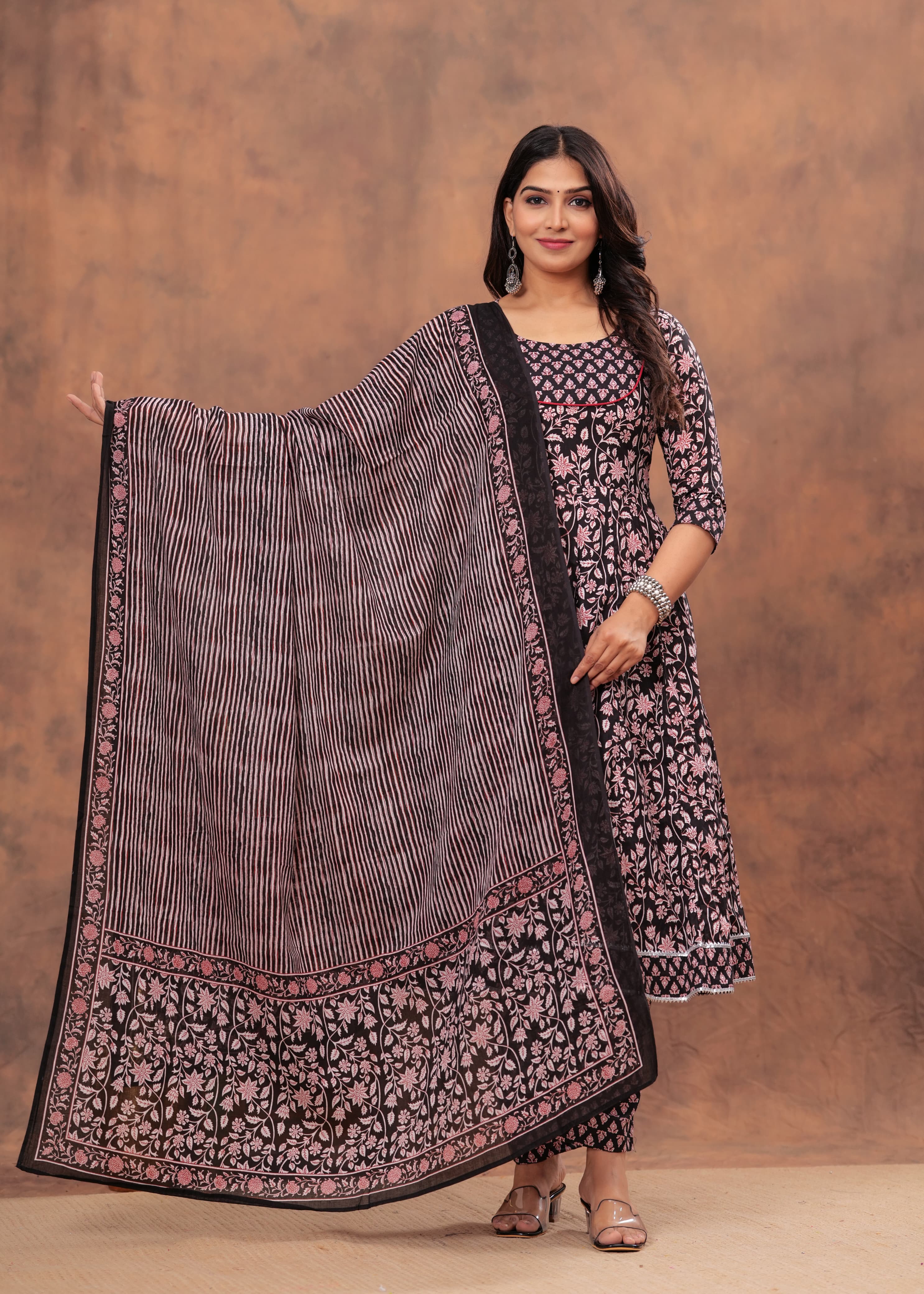 · Design: The Anarkali kurta boasts a delicate floral print, while the dupatta showcases a striking striped design with floral borders, adding an elegant contrast.