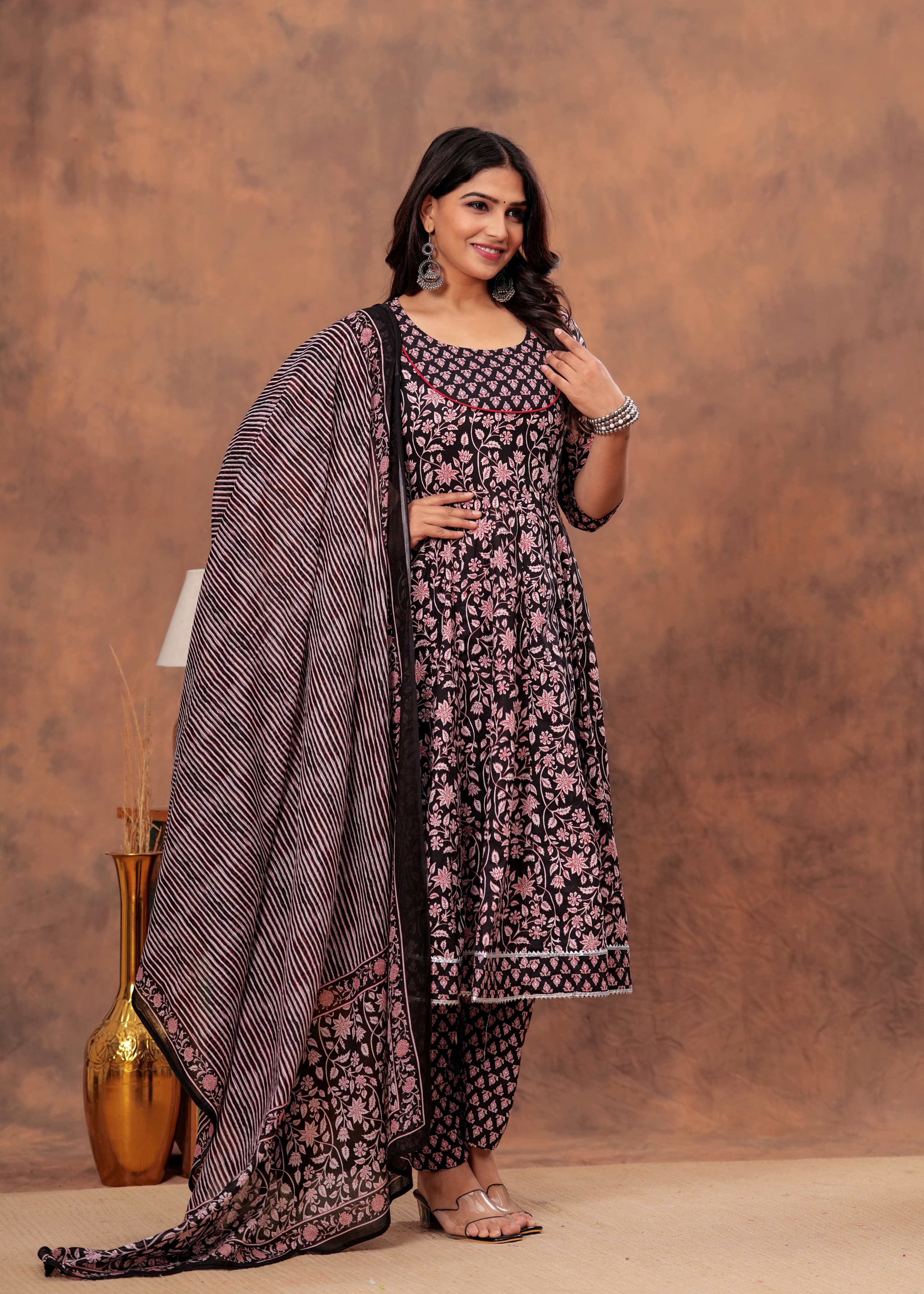 Elevate your ethnic wardrobe with this stunning black and pink floral Anarkali set. Featuring a beautiful floral print paired with a bold striped dupatta, this outfit is perfect for those looking to make a statement while staying comfortable.