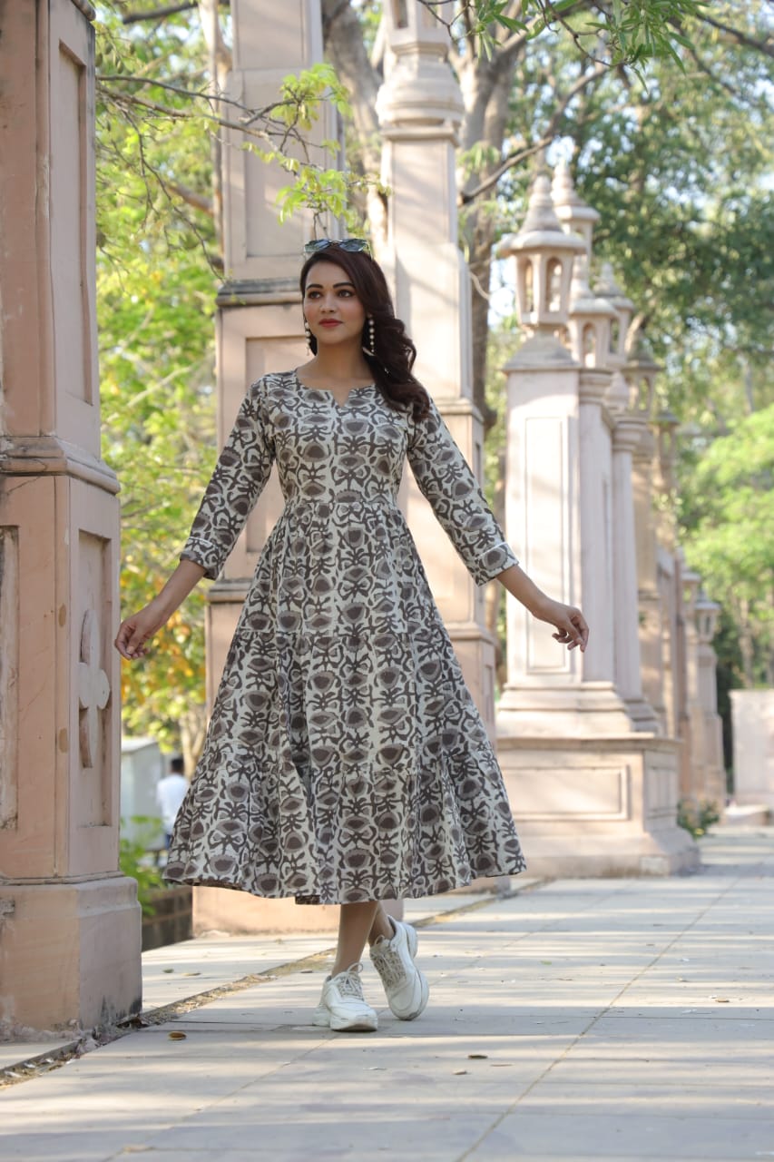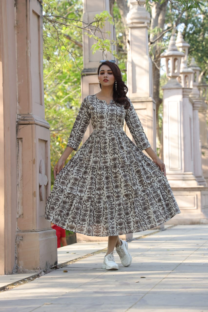 Step into earthy elegance with this brown handblock print cotton midi dress, designed to give you both comfort and sophistication. Featuring a classic fit-and-flare silhouette with a flowy hemline, this dress is perfect for casual outings, office wear, or relaxed get-togethers. The intricate white handblock-inspired motifs on the deep brown base add a timeless ethnic touch while keeping it modern and versatile...