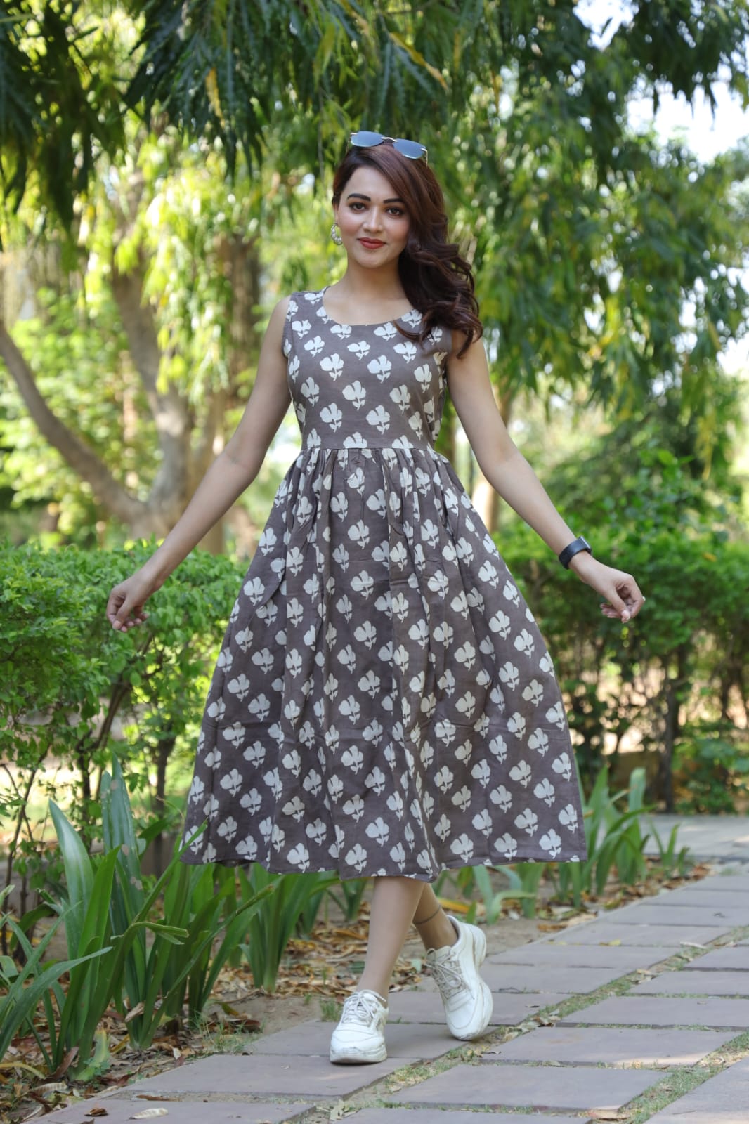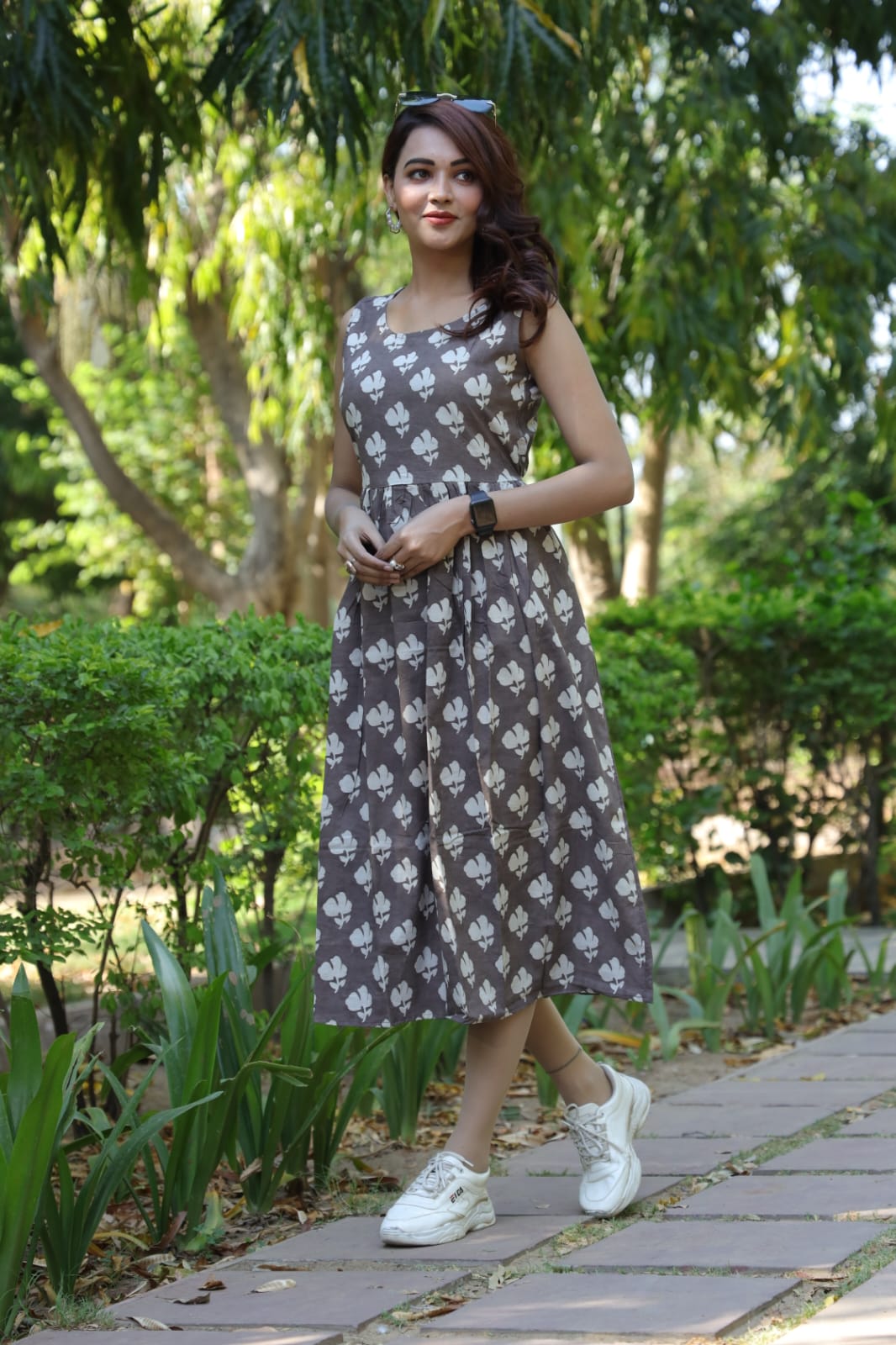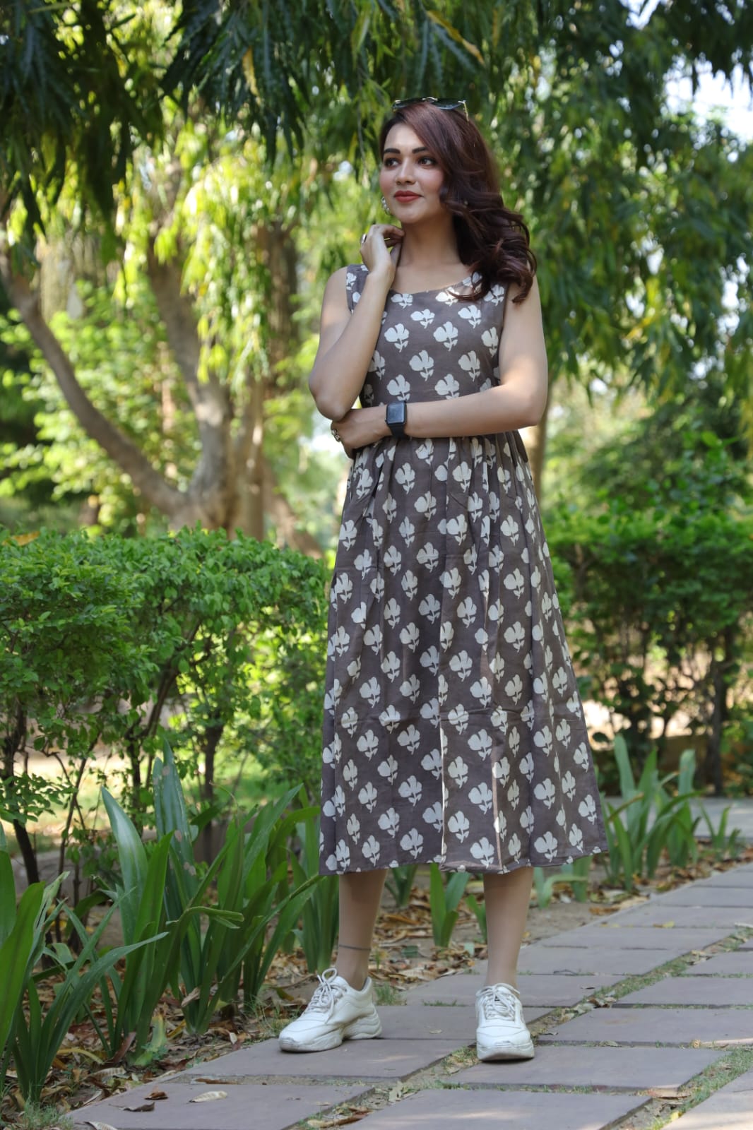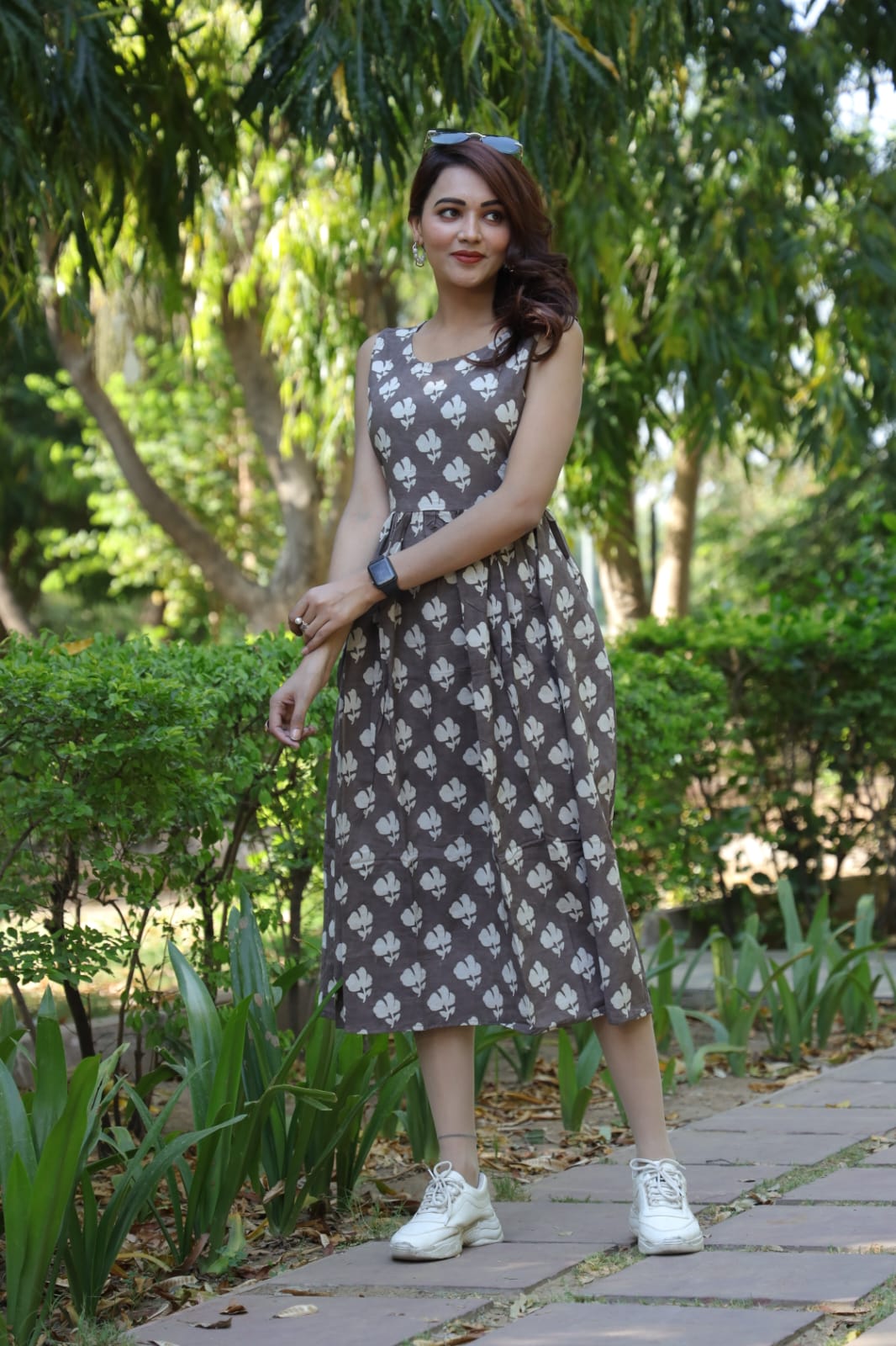 Embrace effortless style with this casual brown floral print fit and flare dress. The simple yet charming design features a soft brown base with a clean, white floral pattern, perfect for warm-weather outings. The flattering A-line silhouette and sleeveless design offer both comfort and style, making this dress an ideal choice for daytime activities, casual outings, or a relaxed weekend look.