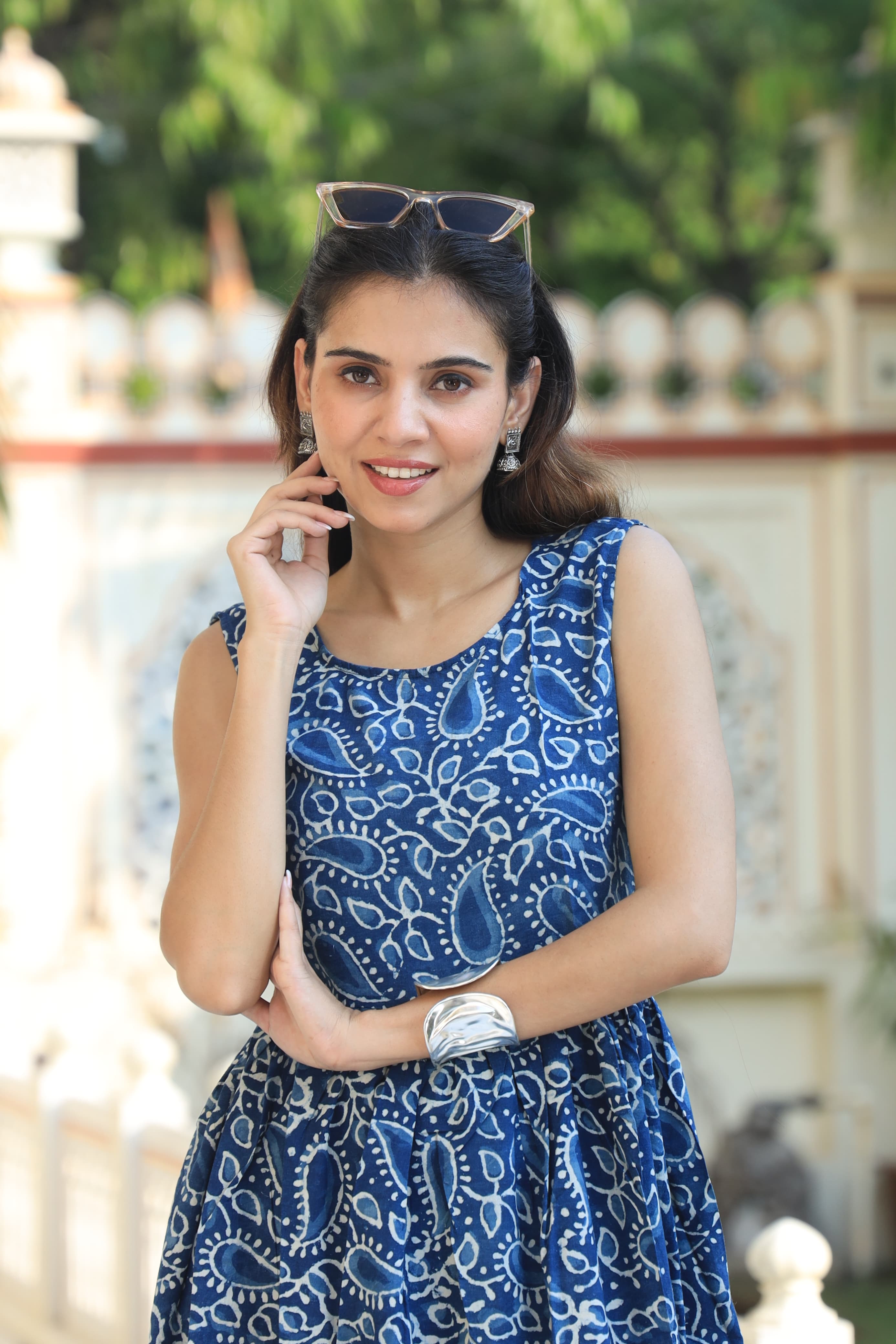This chic blue paisley print fit and flare dress combines timeless elegance with a trendy design. The dress features a beautiful blend of navy blue and white paisley patterns, adding a touch of traditional charm to your wardrobe. The flattering A-line silhouette and sleeveless design make it a perfect choice for casual outings, brunch, or any event where you want to look stylish yet feel comfortable.