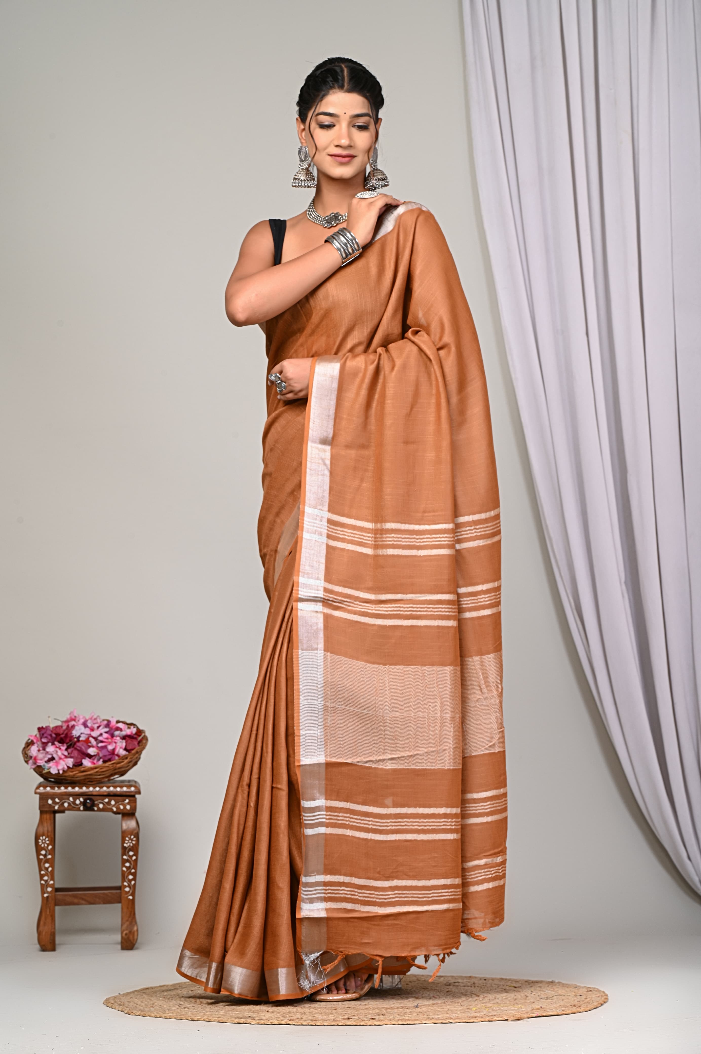 Elevate your ethnic style with this Classic Coffee Brown Handloom Saree, designed for lovers of earthy elegance. Woven from a rich cotton silk blend, this saree combines traditional weaving with contemporary subtlety. The silver zari border and pallu detailing add the perfect touch of festive shimmer while keeping the look grounded and graceful.