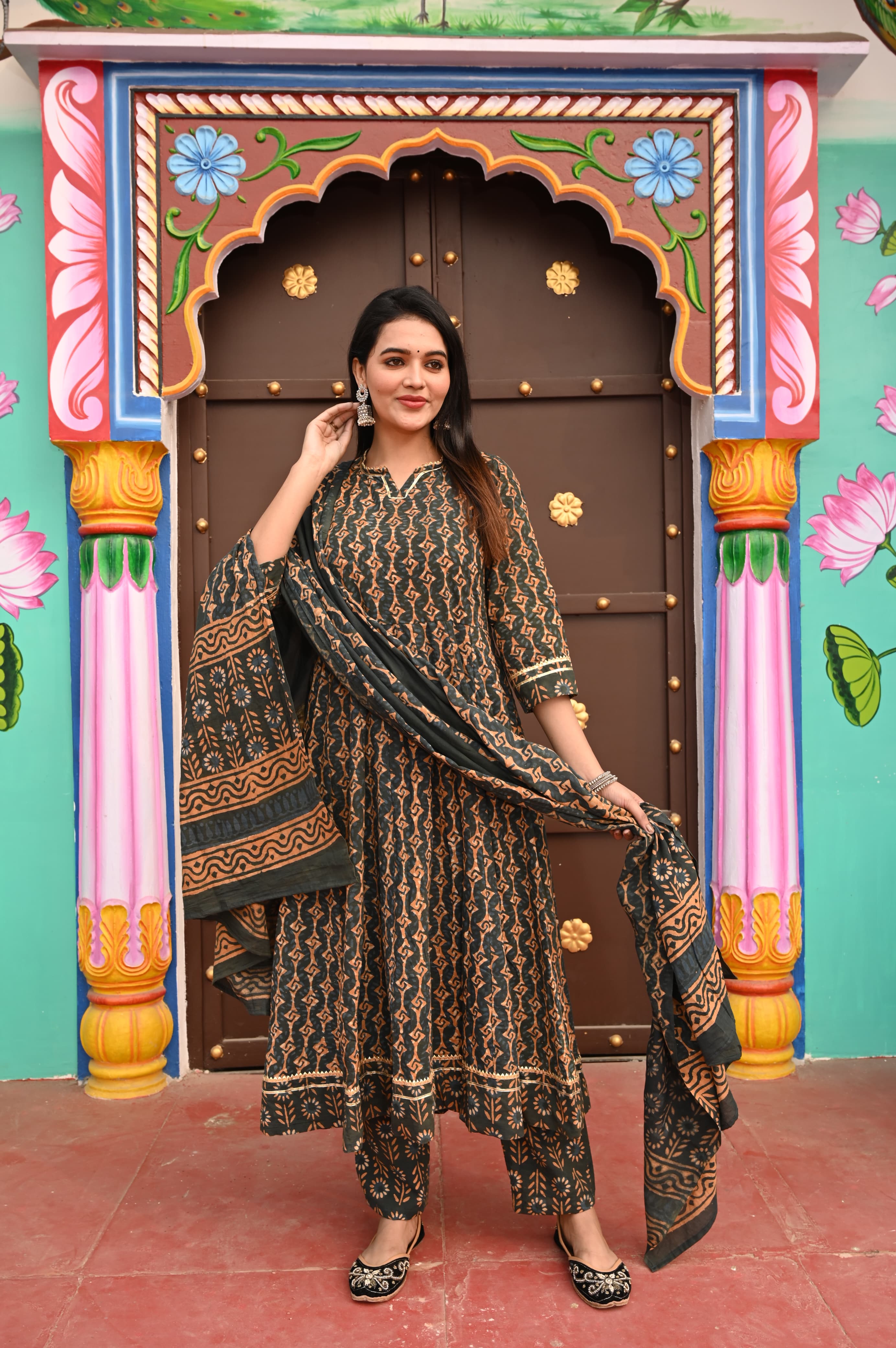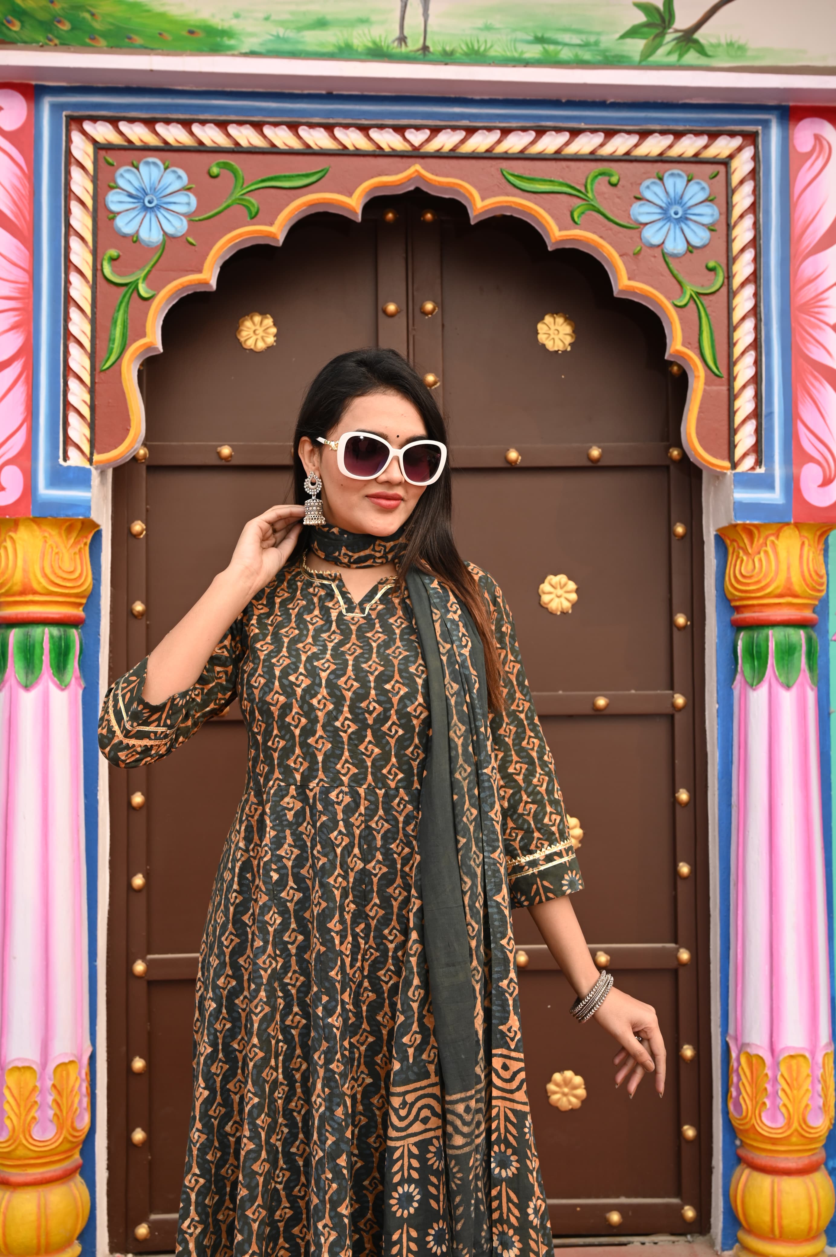 Make a bold style statement with this stunning dark green Anarkali set. Featuring beautiful traditional prints, this ensemble is perfect for both casual and festive occasions, offering you a chic yet comfortable look.