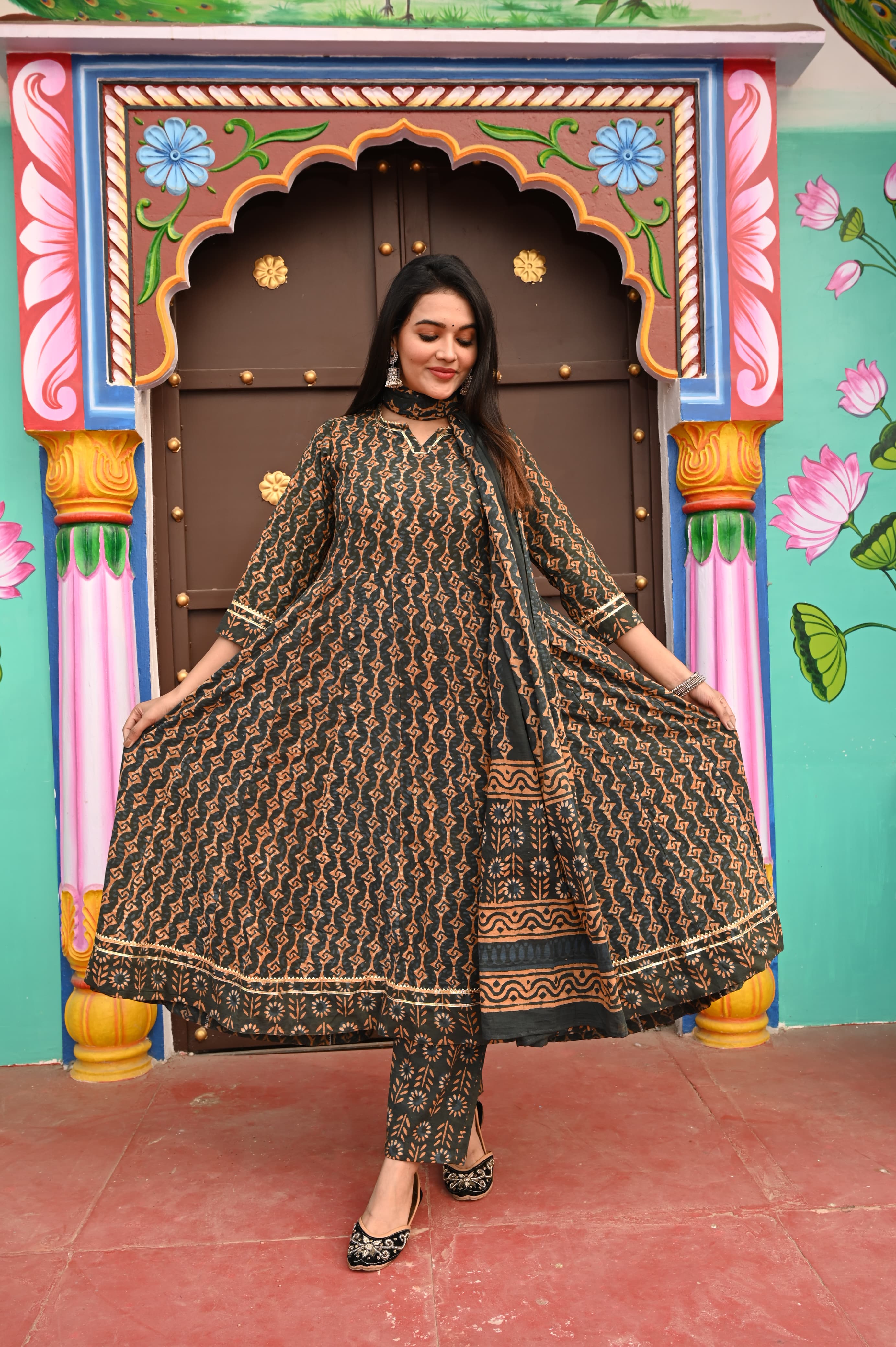 · Design: The Anarkali kurta is adorned with detailed traditional prints, complemented by a matching dupatta with similar patterns, giving a cohesive and elegant touch.