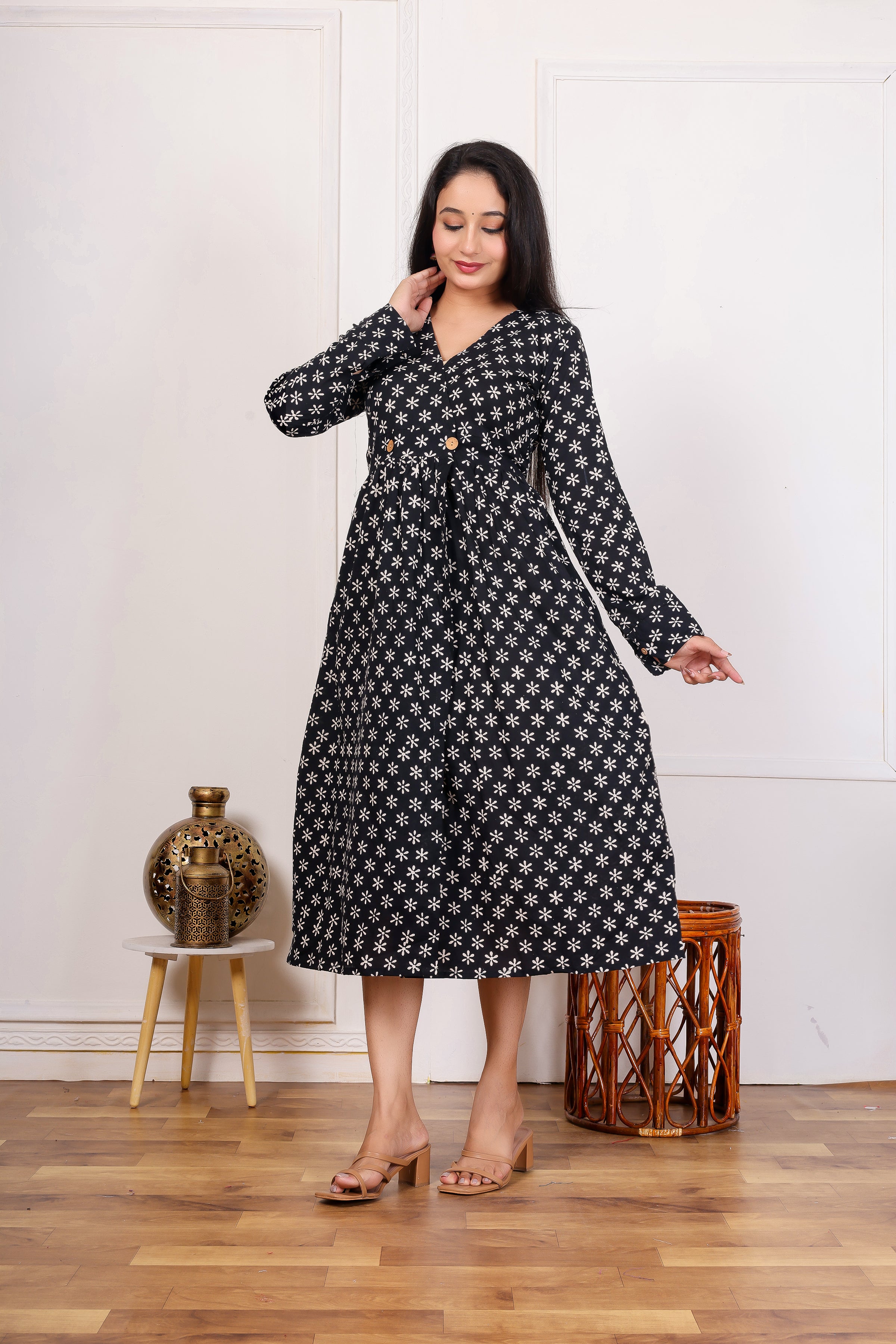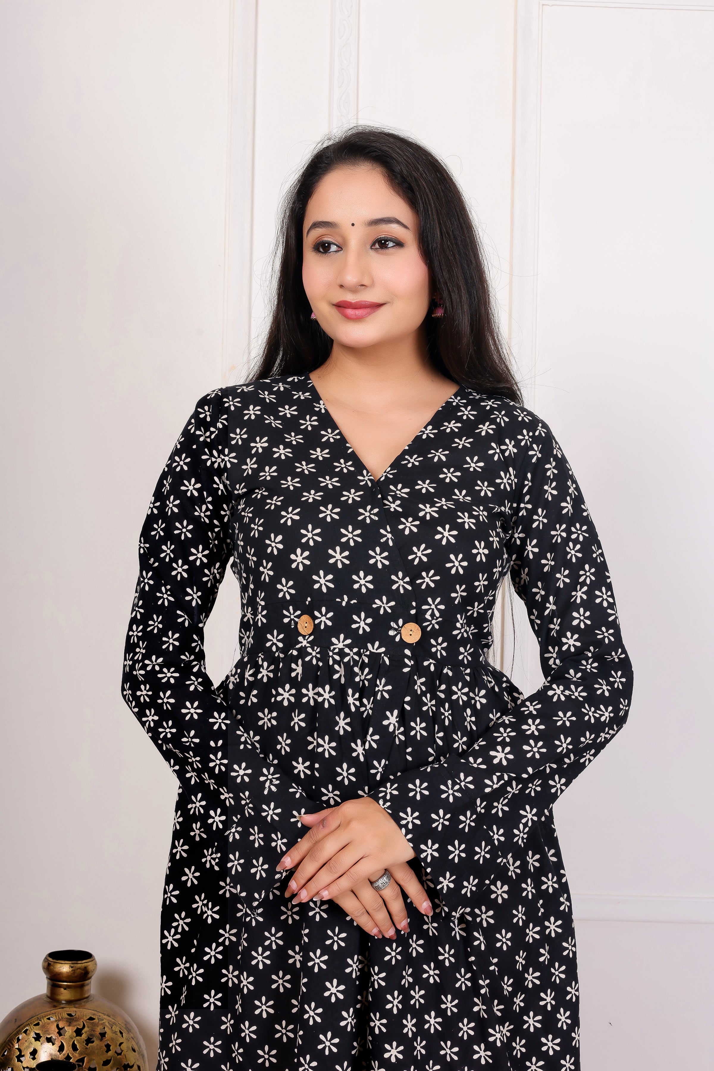 Step into a world of timeless elegance with this stunning Black Floral Maxi Dress. Perfect for casual outings, brunch dates, or even evening gatherings, this dress features a classic black base adorned with delicate white floral prints, making it a versatile piece for every occasion. Designed with a flattering V-neckline and long sleeves, this dress offers both style and comfort. The button detailing at the waist adds a subtle yet chic touch, accentuating your silhouette for a flattering fit. The flowing, A-line skirt ensures freedom of movement, creating an effortlessly graceful look.