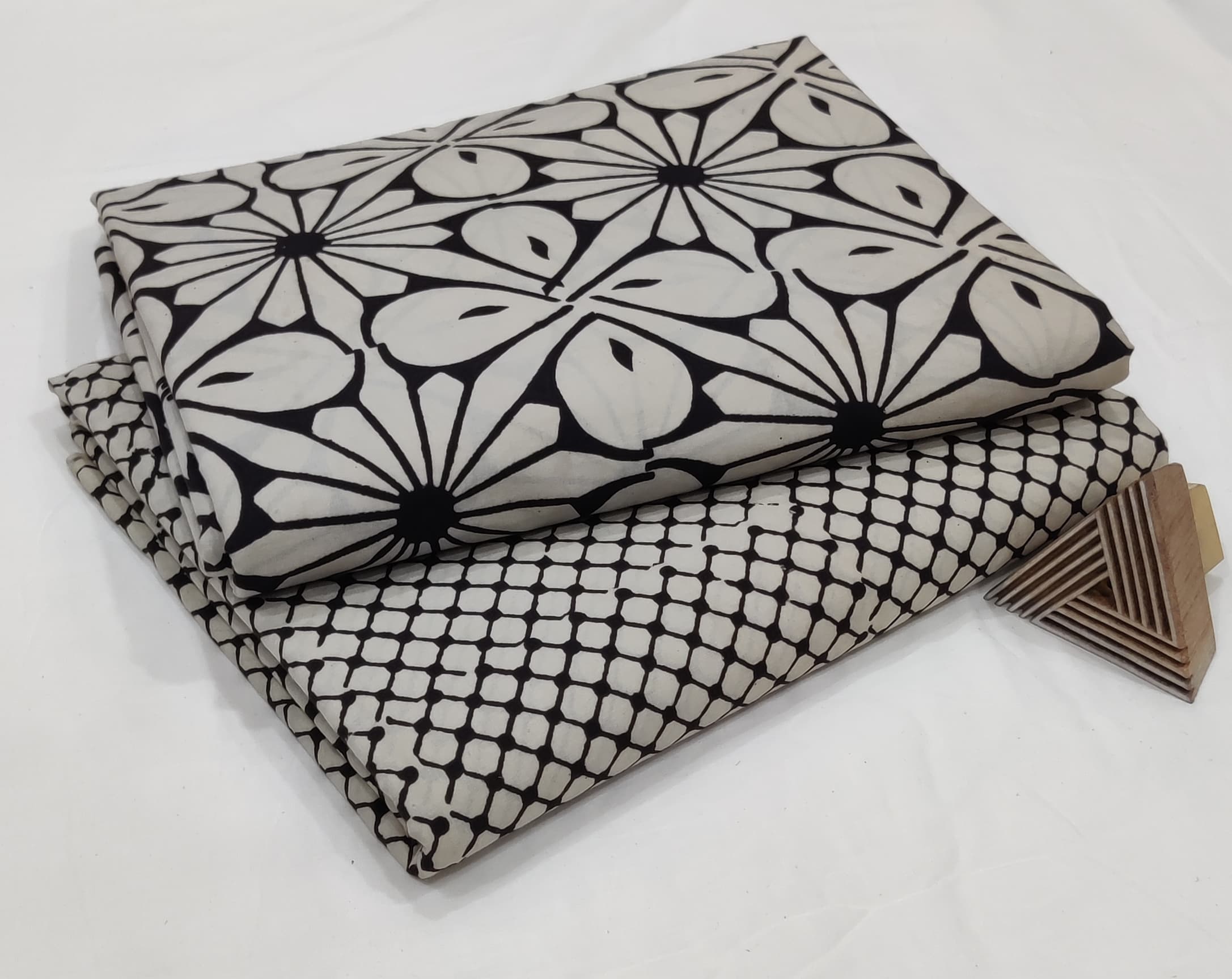Timeless elegance meets traditional craftsmanship in this stunning black and white fabric combo – a must-have for lovers of classic fashion and artisan prints.