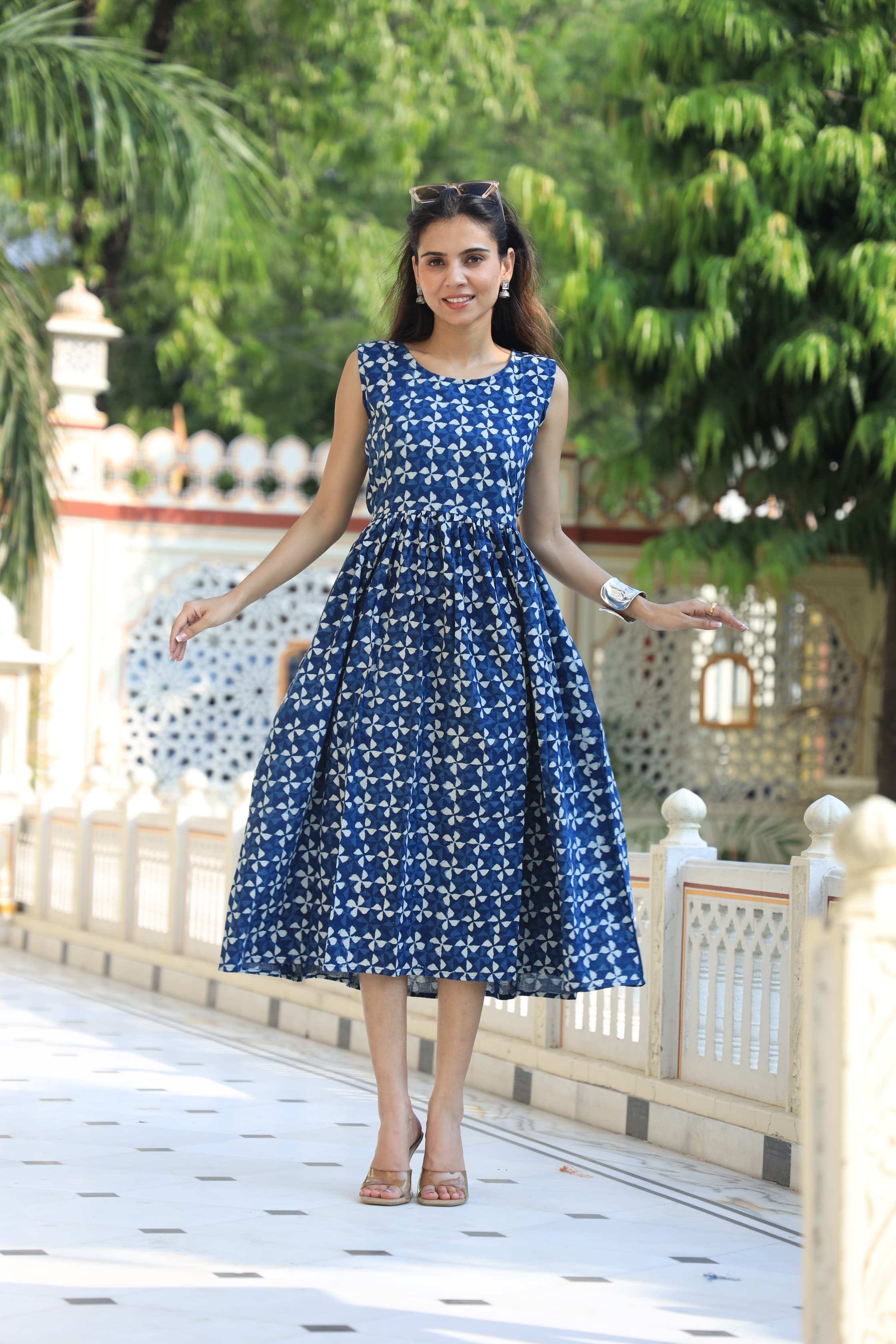 Step out in style with this stunning blue floral printed fit and flare dress, designed to turn heads wherever you go. The rich navy blue fabric adorned with a crisp white geometric pattern offers a perfect blend of sophistication and contemporary flair. This dress is crafted with a sleeveless design and a flattering A-line silhouette, making it both comfortable and fashionable for any occasion. Whether it's a casual day out, brunch with friends, or a semi-formal gathering, this dress effortlessly combines comfort and style.