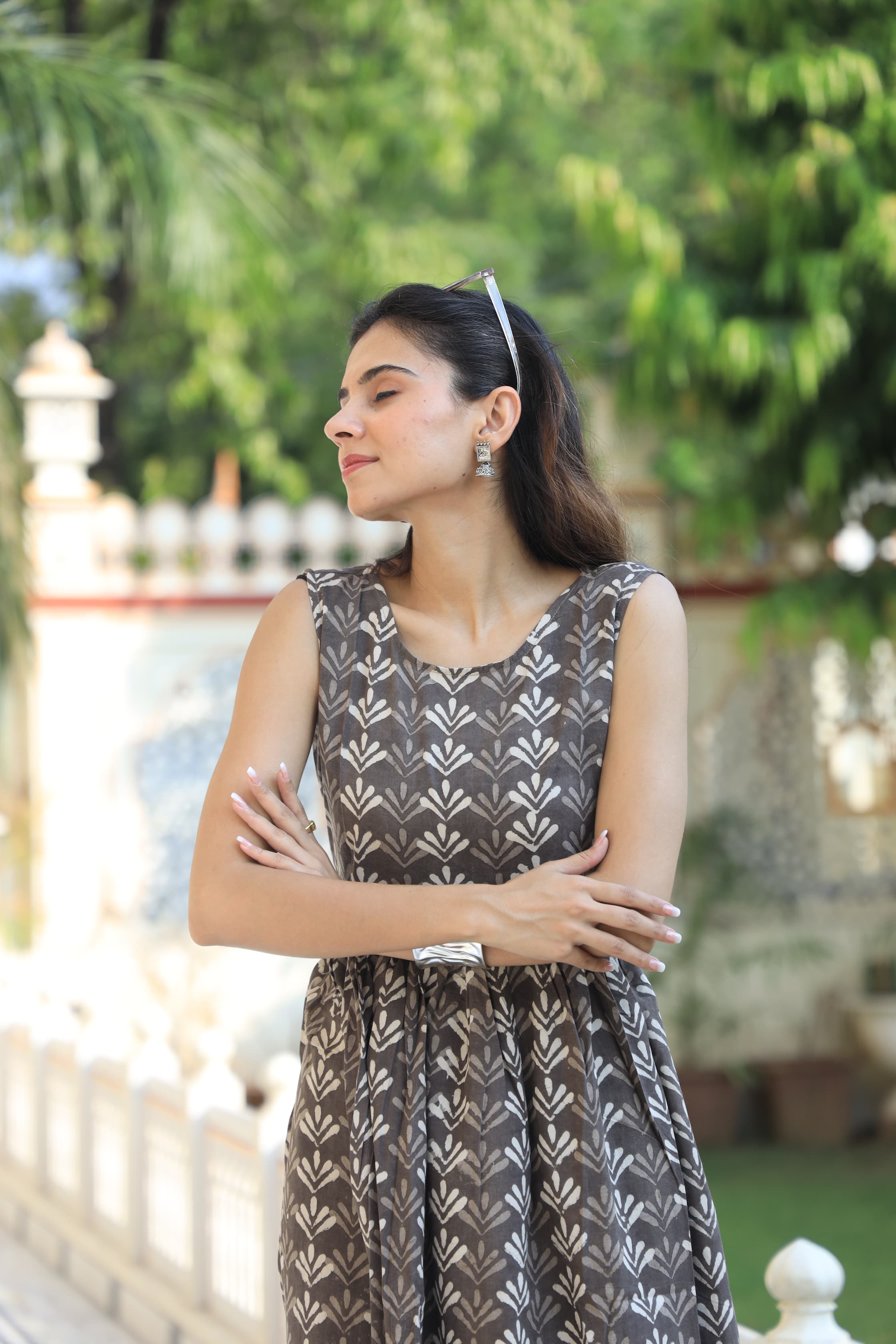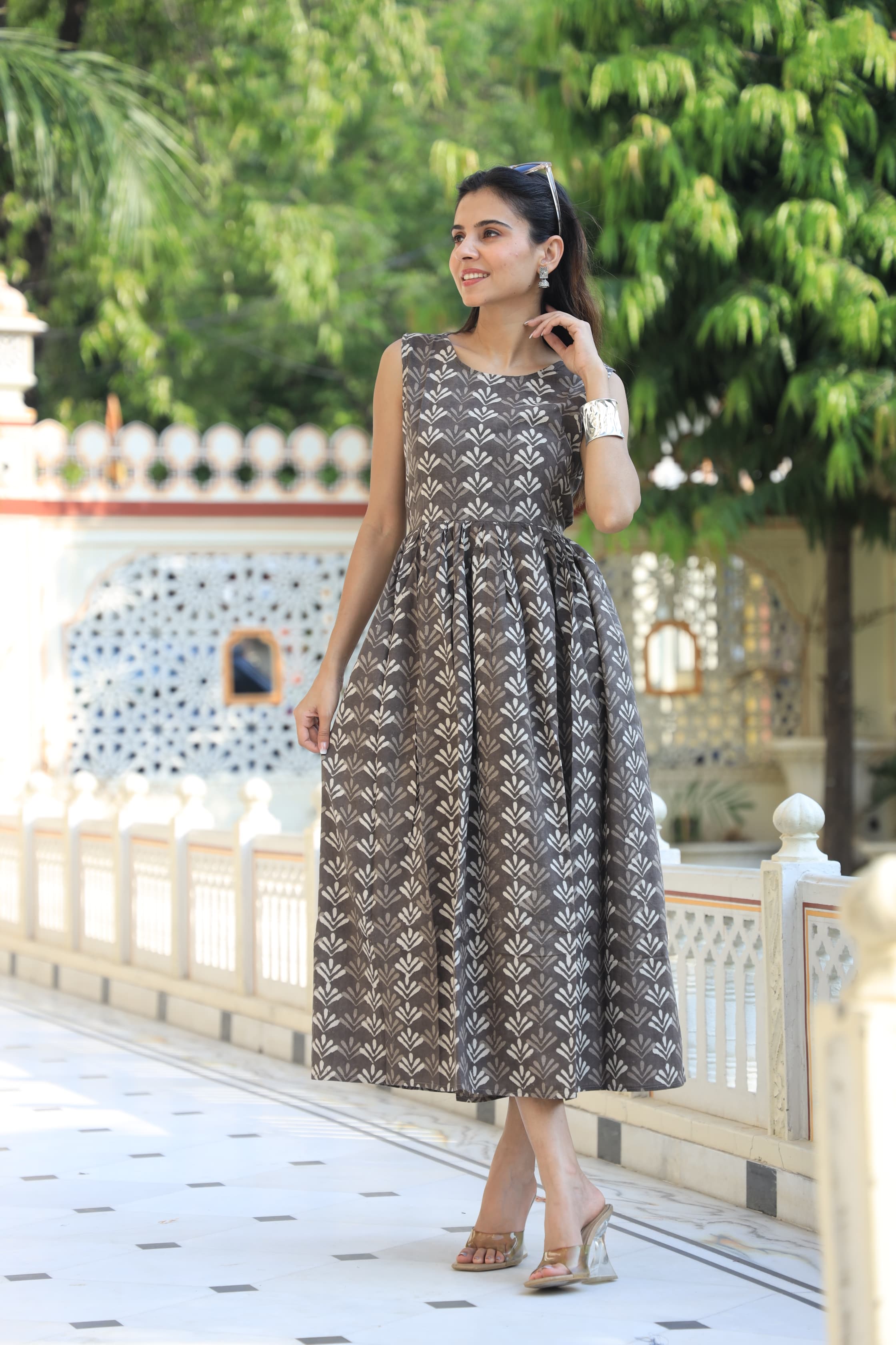 This gorgeous brown and white floral print fit and flare dress combines classic design with contemporary style. Featuring a sophisticated A-line silhouette and sleeveless design, it offers both elegance and comfort. The neutral brown shade with delicate white geometric patterns makes it a versatile addition to your wardrobe, suitable for both casual outings and semi-formal events.