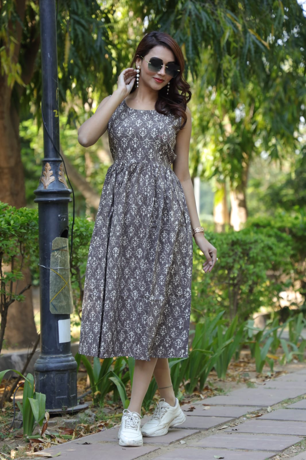 This elegant brown floral print dress offers a perfect mix of sophistication and comfort. Featuring a delicate floral pattern in subtle tones of brown and beige, it adds a refined touch to your wardrobe while maintaining a relaxed, everyday vibe. The fit-and-flare style ensures a flattering silhouette, making it an ideal choice for any casual outing or gathering.