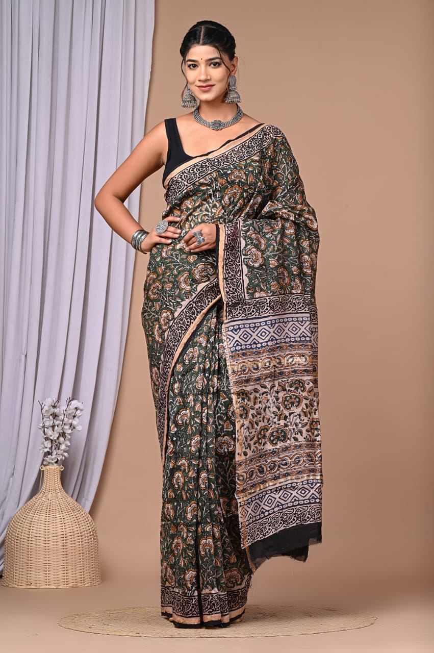 Step into elegance with our Green & Beige Handblock Printed Chanderi Saree, a perfect harmony of traditional charm and modern grace. Designed for the woman who appreciates art and heritage, this saree showcases beautifully detailed floral and ornamental prints in earthy tones on a deep green base, enhanced with a beige pallu featuring intricate geometric and folk-inspired patterns.