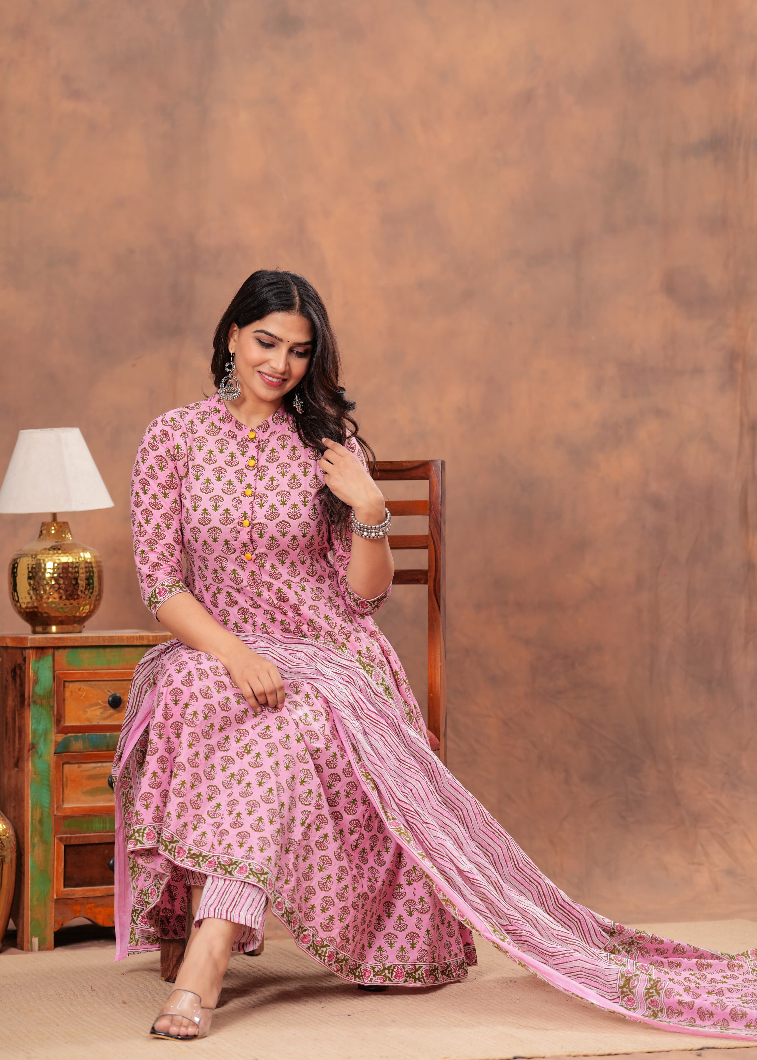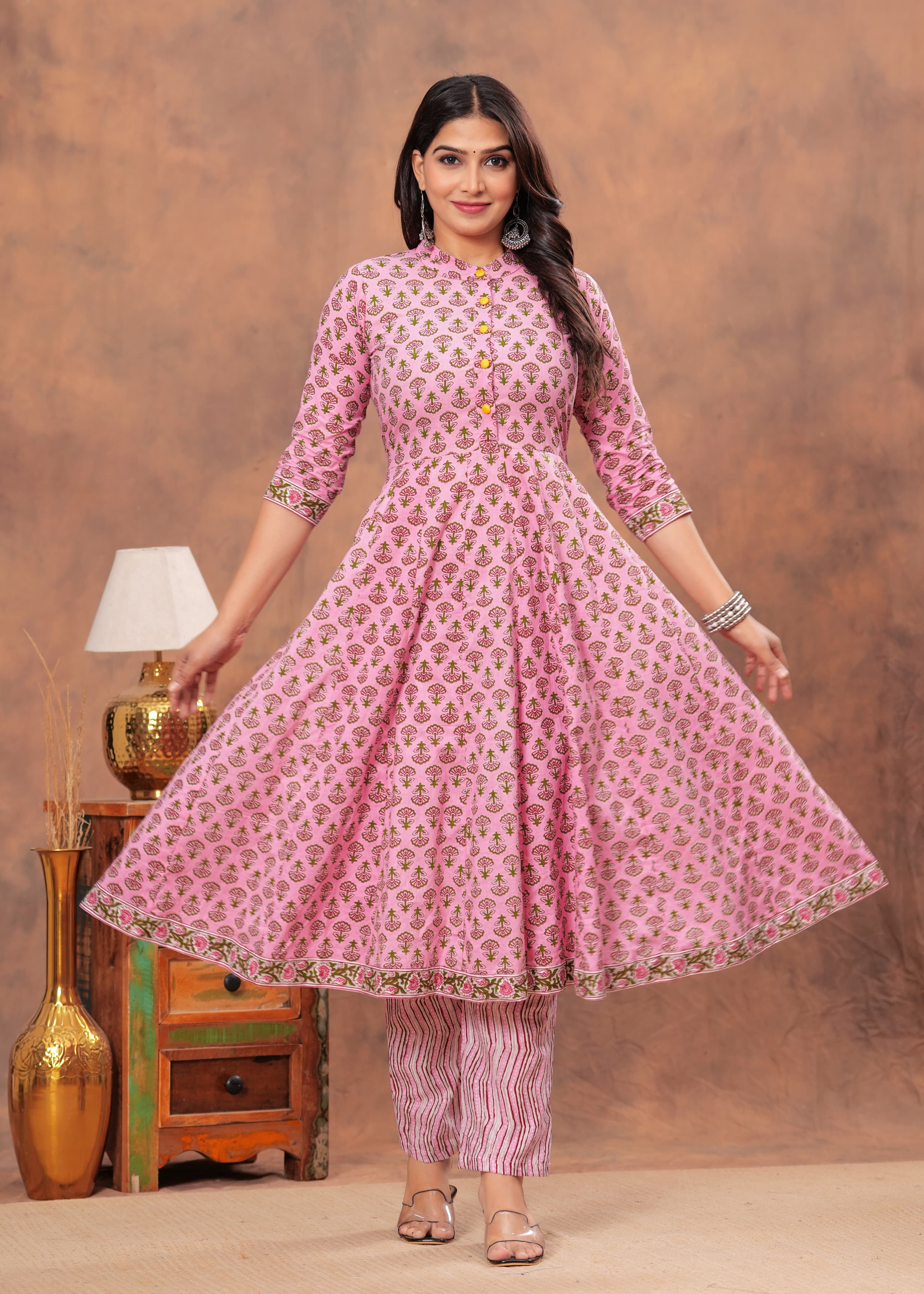 Step into timeless elegance with this charming pink floral Anarkali set. Featuring delicate floral prints and a beautiful striped dupatta, this ensemble offers a perfect balance of tradition and contemporary style.