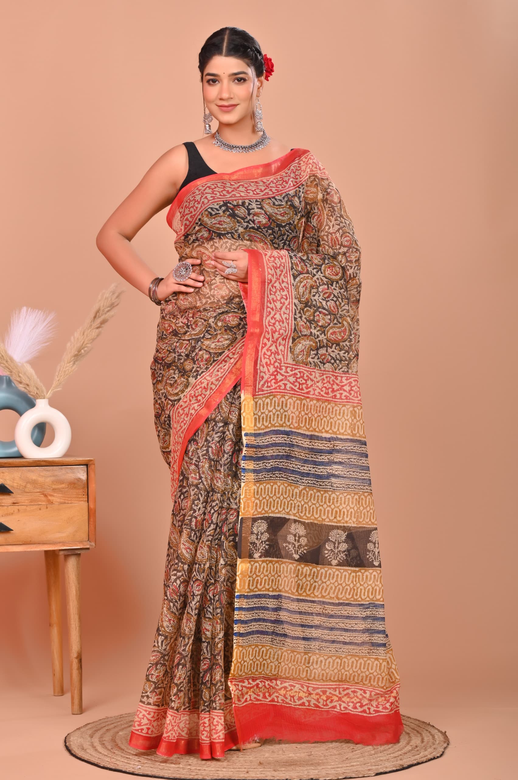 Unveil a rich tapestry of tradition and style with this timeless Kota Doria Saree, exquisitely designed with earthy tones, intricate prints, and a vibrant red zari border. The body features an elaborate leaf and floral pattern in rust, beige, and olive hues, reflecting traditional Indian artistry. The pallu is a masterpiece in itself—featuring multi-patterned bands in blue, mustard yellow, and black, adorned with floral and geometric motifs for a statement finish.