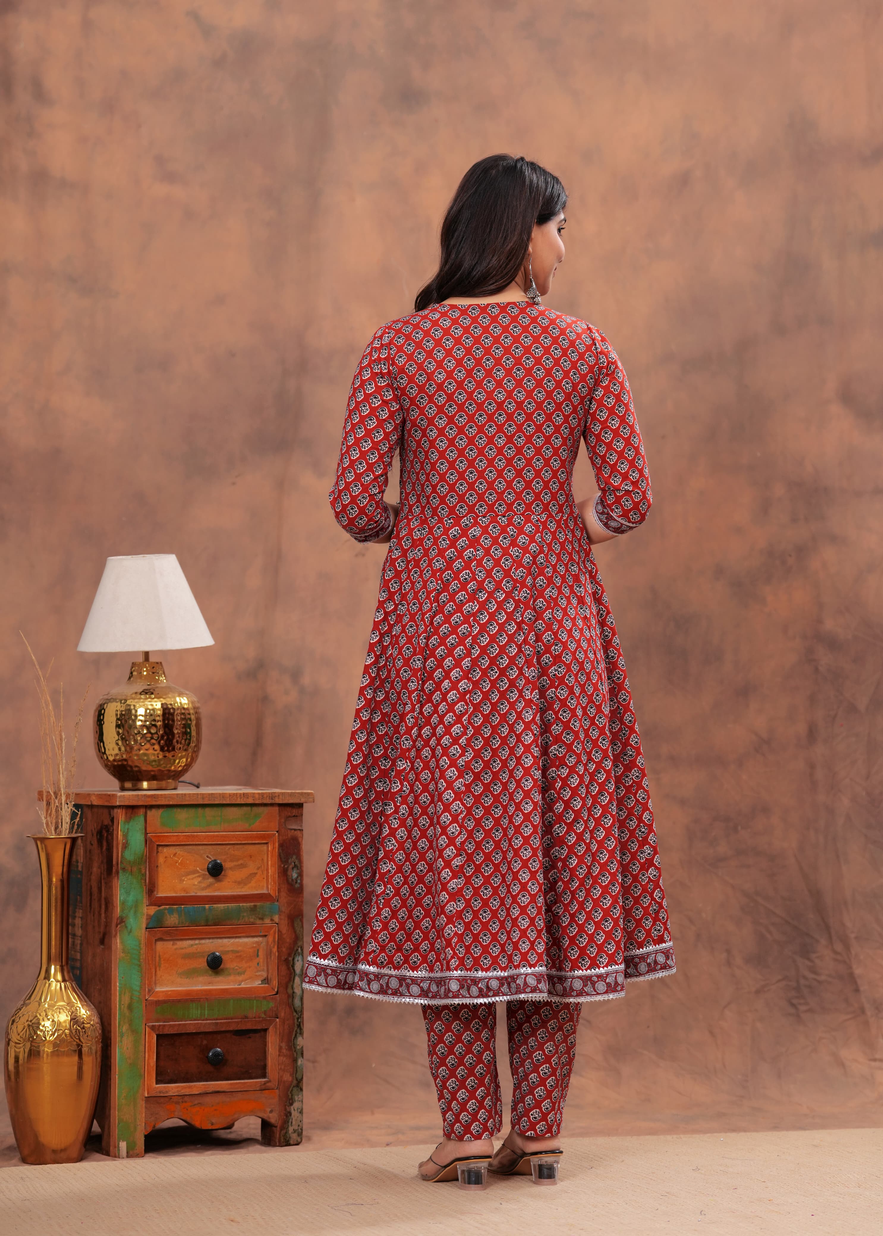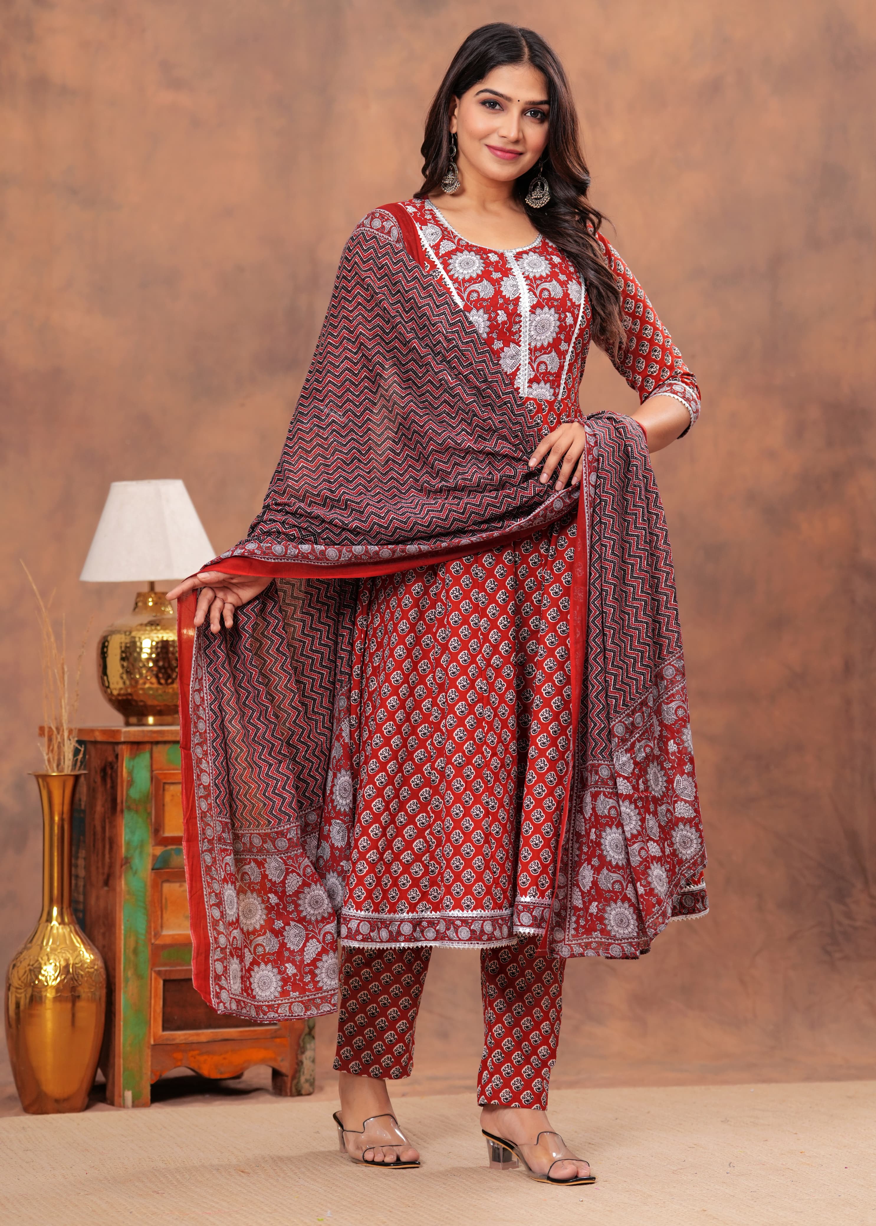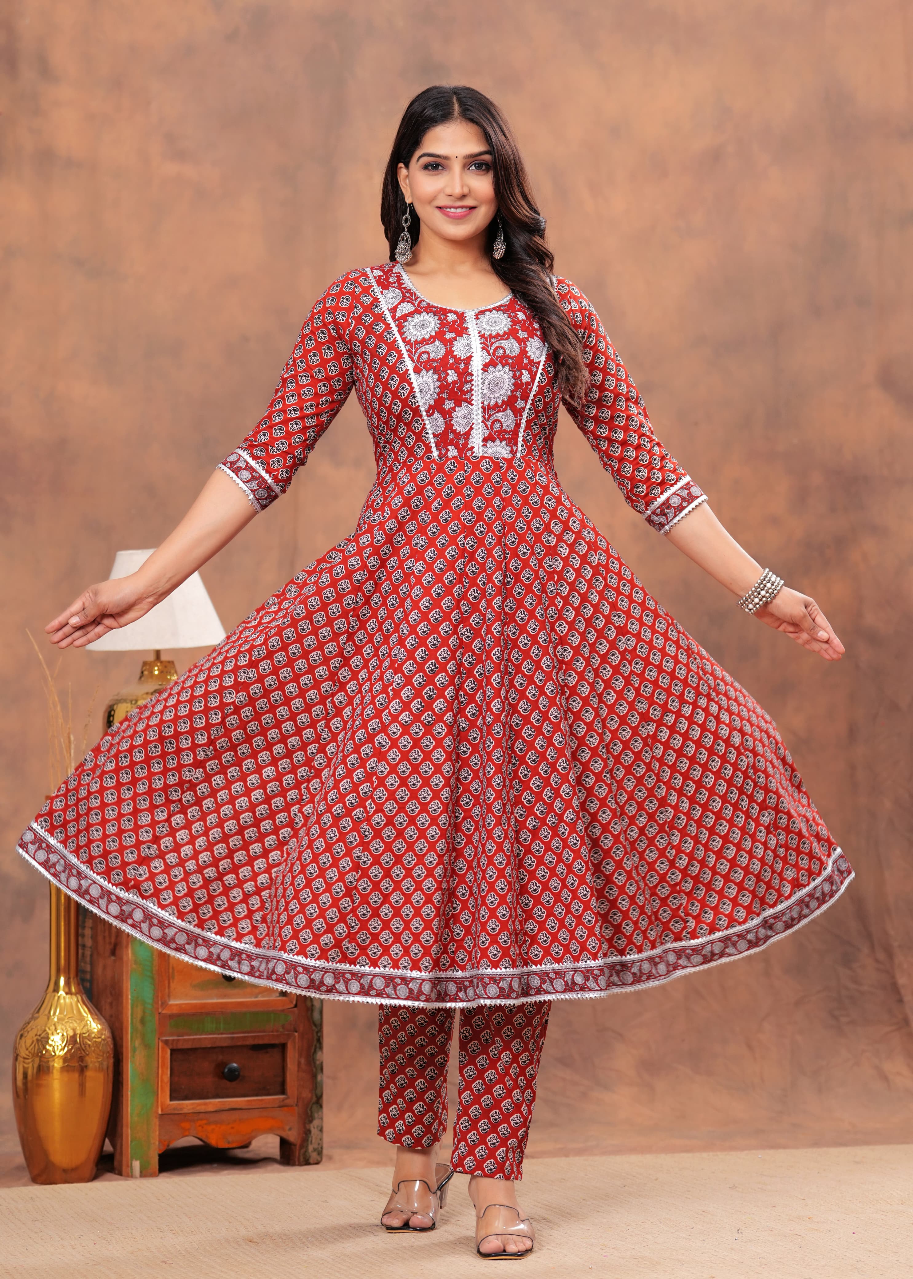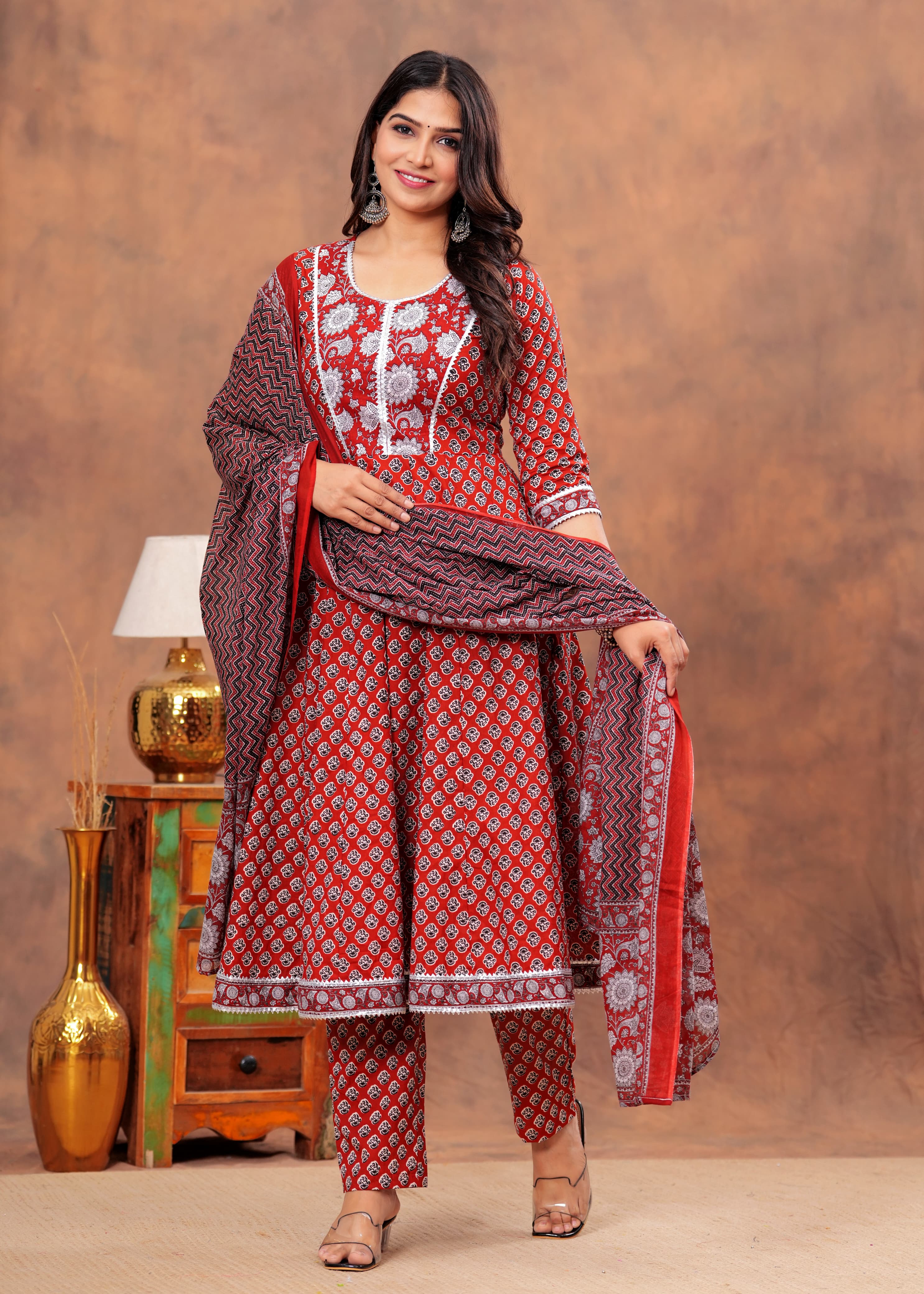 Introducing our Elegant Red Printed Anarkali Set – a perfect fusion of tradition and style. This stunning ensemble is designed to make you stand out at any festive occasion or gathering.