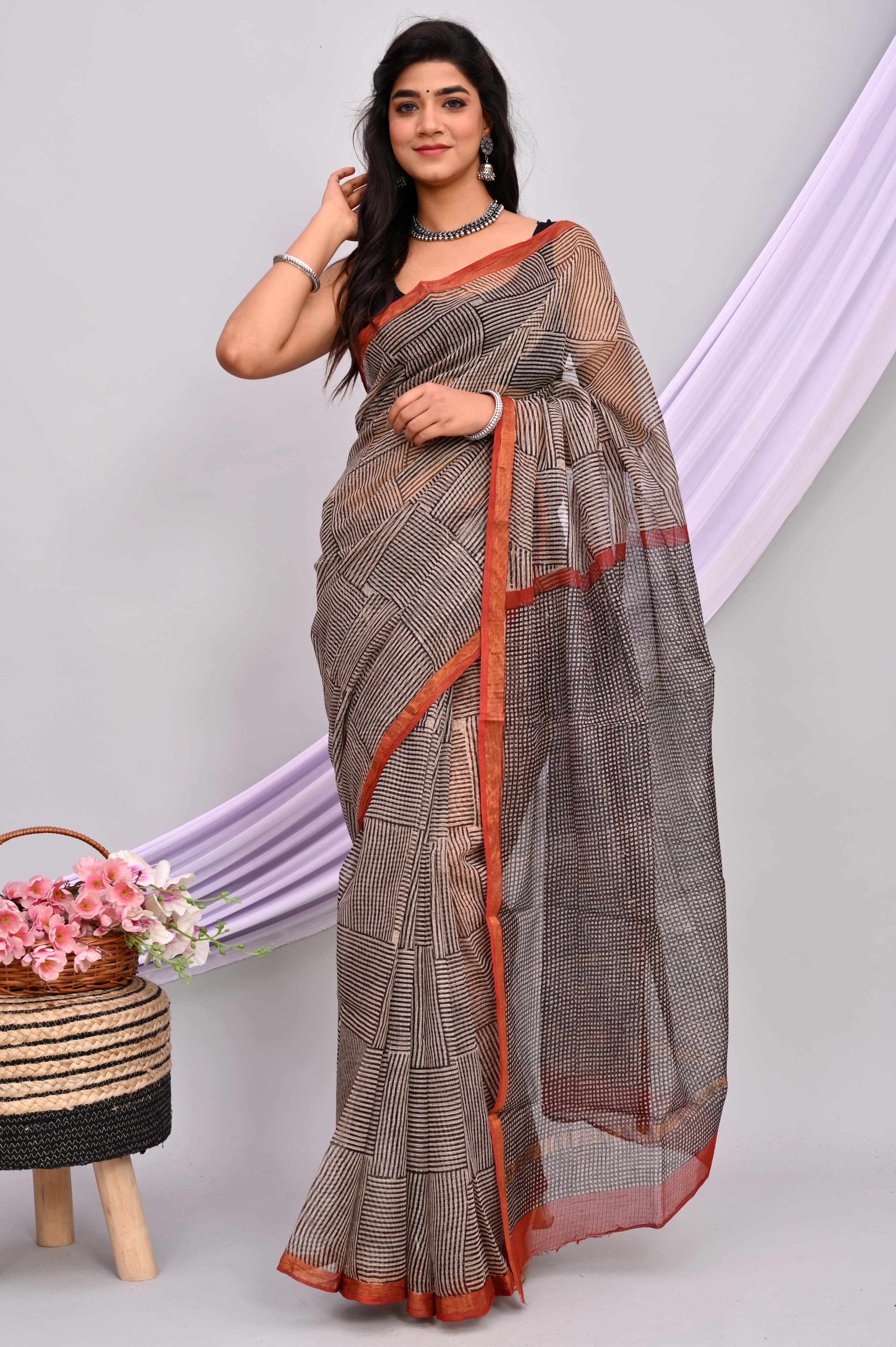 Step into a world of timeless grace with this striking Kota Doria Saree featuring a bold and modern geometric block print. Designed for the contemporary woman with a love for heritage textiles, this saree blends black and beige abstract square patterns with a pop of elegance through its contrasting rust-orange border. The intricate handblock-inspired design gives it an artisanal touch while keeping it minimalist and modern.
