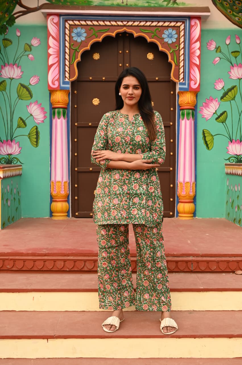 Add a refreshing charm to your ethnic wardrobe with this Green Floral Printed Cotton Co-Ord Set, designed for women who love elegance wrapped in comfort. The lush green base with intricate floral patterns brings a vibrant yet graceful vibe to your look.