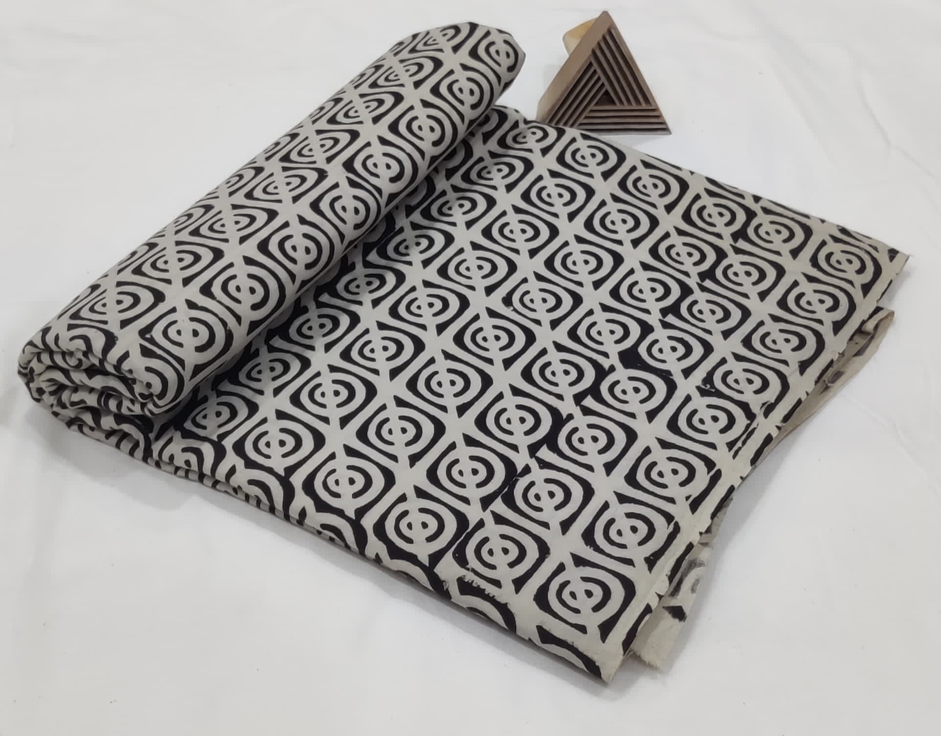 Unleash your creativity with this stunning Hand Block Printed Cotton Fabric, featuring oversized petal and floral burst motifs in bold black and soothing grey on an off-white base. The eye-catching design is carefully hand-stamped using eco-friendly dyes and carved wooden blocks, celebrating age-old Indian craftsmanship with a modern flair.
