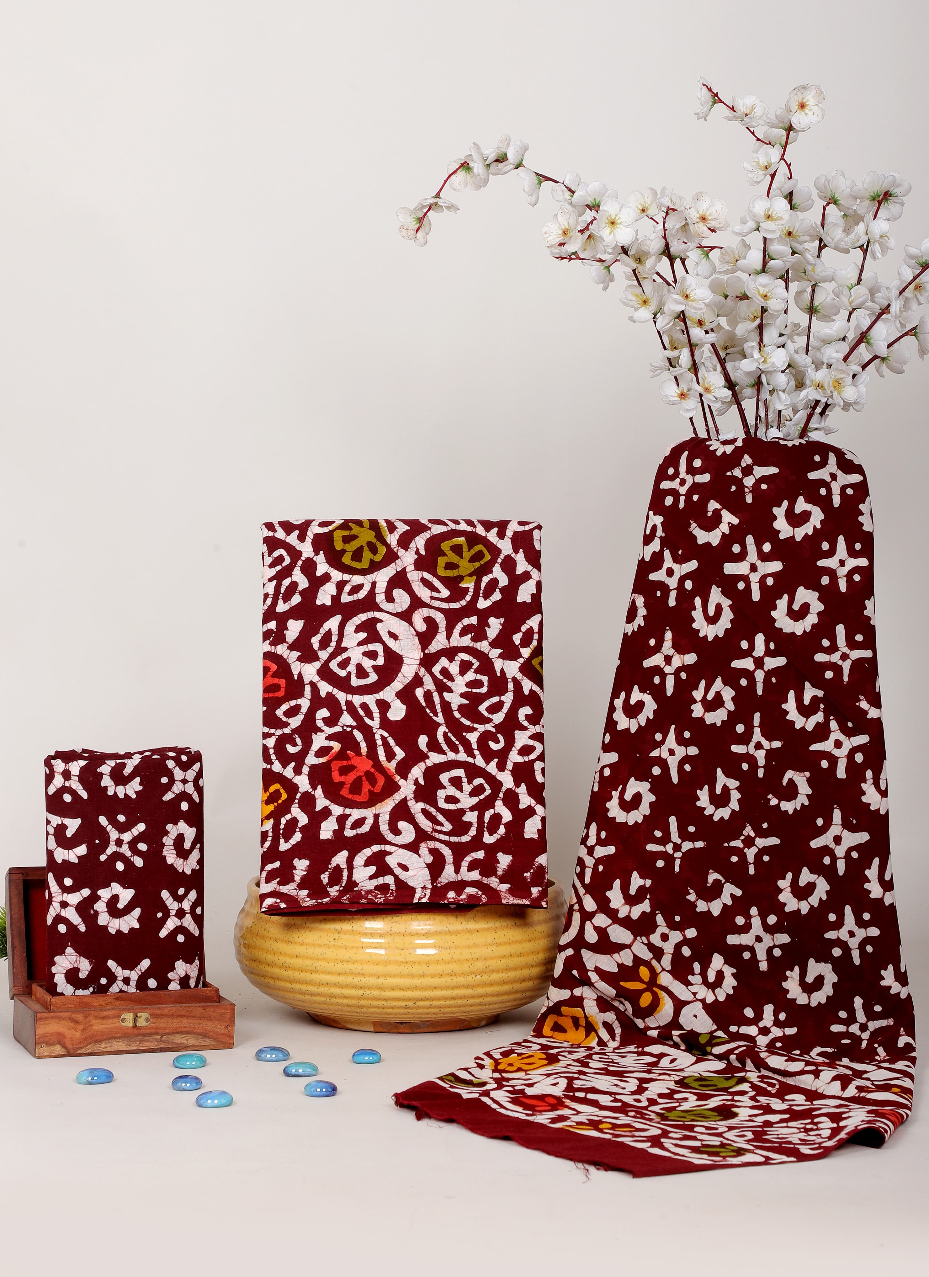 Elevate your ethnic collection with this maroon Batik cotton dress material set, blending tradition with timeless style. Adorned with intricate hand-dyed motifs, this set is designed to give you comfort while making you stand out effortlessly.
