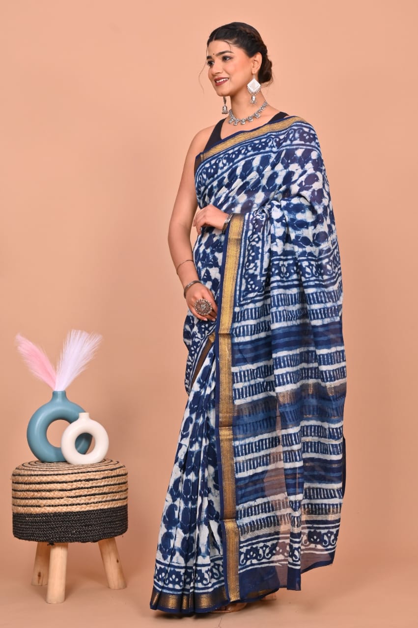 Make a bold, artistic statement with this exquisite Indigo Blue & White Shibori Chanderi Saree, a masterpiece of hand-dyeing and timeless elegance. Adorned with traditional Shibori tie-dye patterns, the saree features a mesmerizing blend of geometric stripes, floral motifs, and abstract forms across a translucent Chanderi silk canvas.