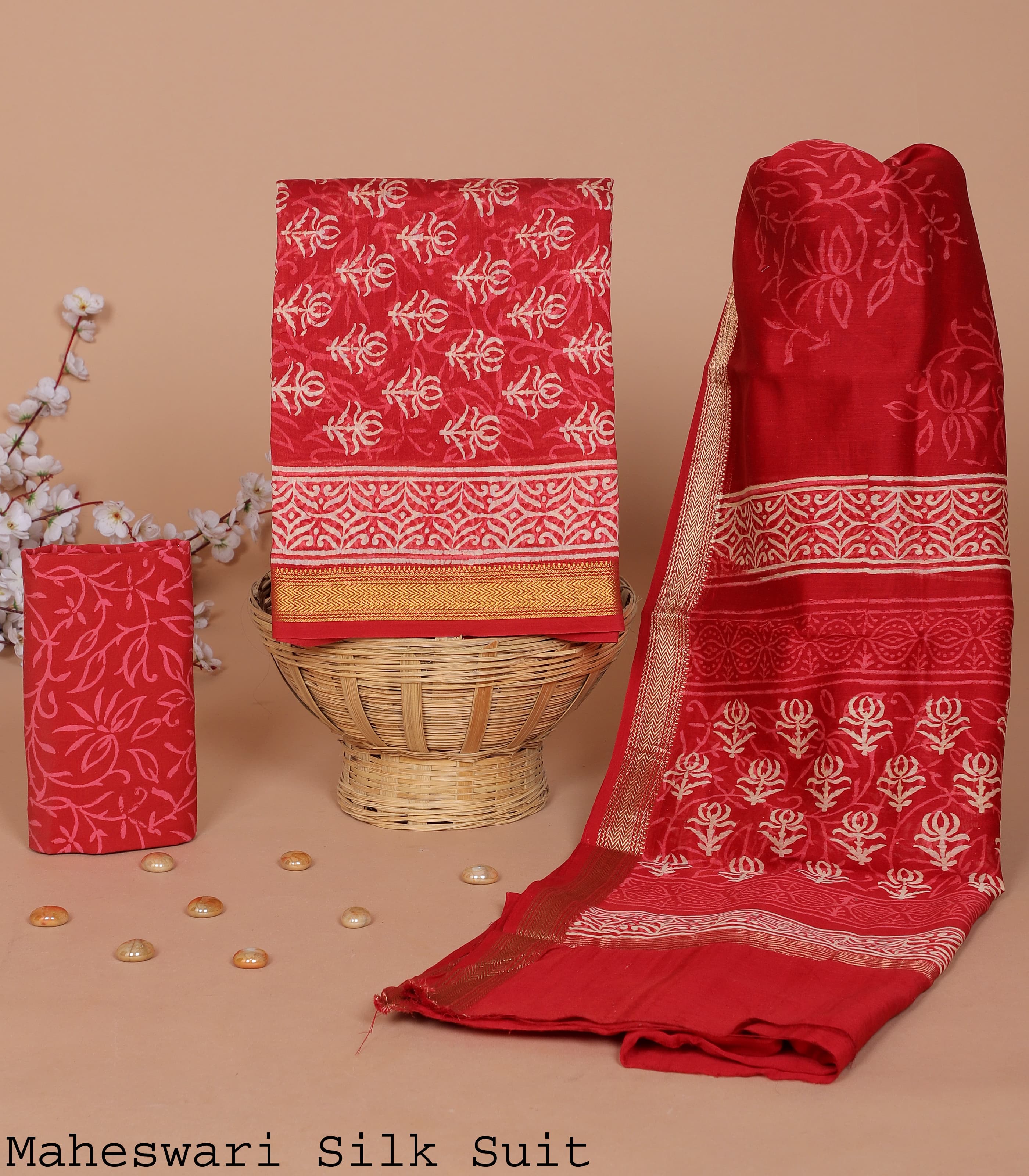 Elevate your ethnic wardrobe with this luxurious Maheshwari Silk Suit in a rich Crimson Red shade, delicately adorned with traditional golden zari motifs and fine craftsmanship. This suit embodies grace, vibrancy, and timeless appeal – perfect for the modern woman who cherishes tradition.