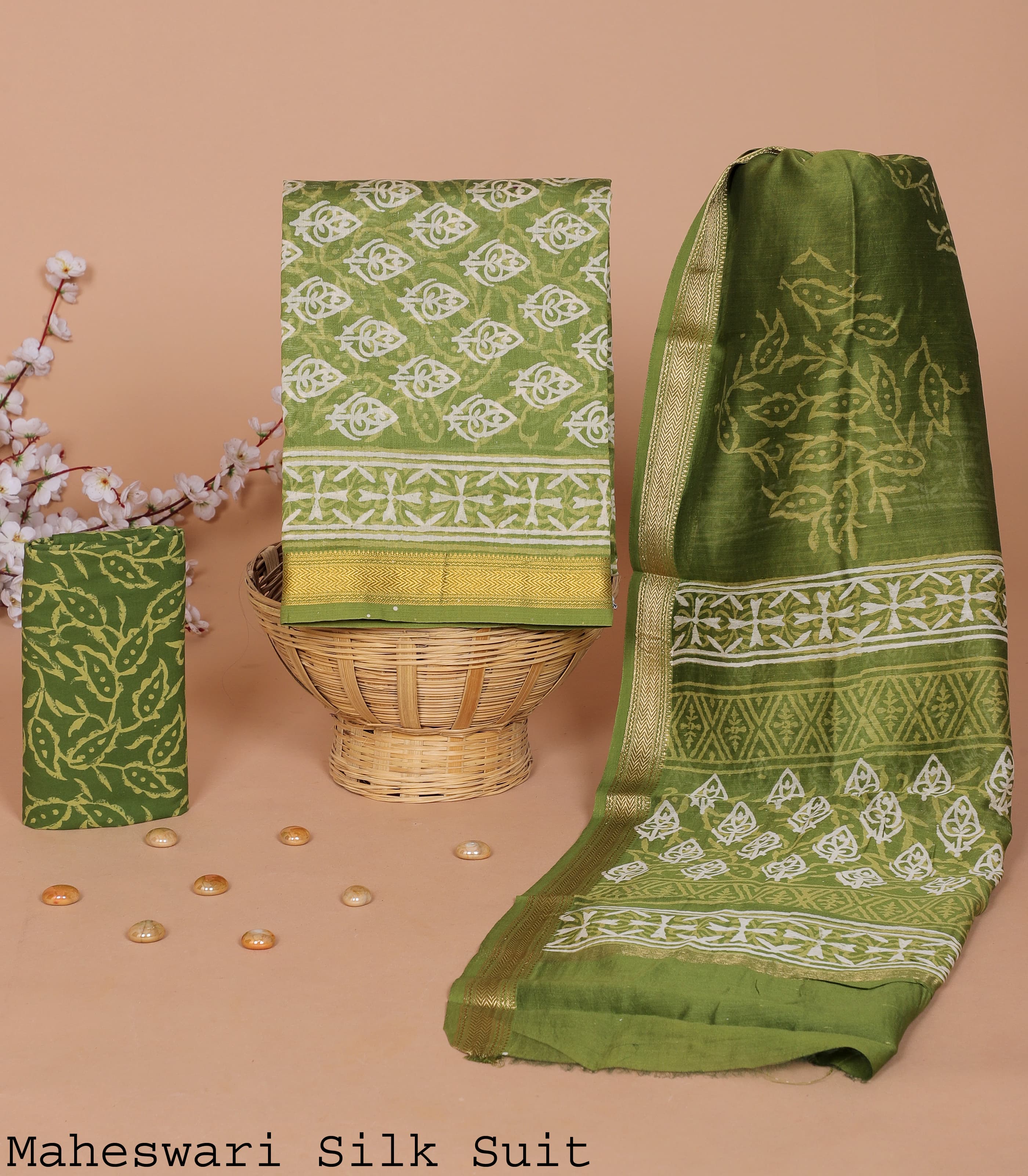 Bring home the perfect blend of tradition and charm with this radiant Maheswari Silk Suit in a refreshing olive green shade. Adorned with delicate handblock motifs and elegant zari borders, this suit is a celebration of Indian craftsmanship.
