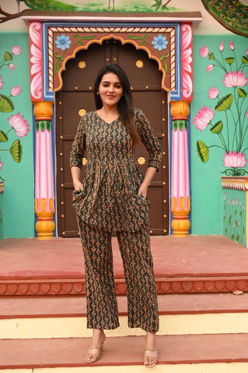 Step into effortless elegance with this Olive Green Handblock Print Co-Ord Set, designed for modern women who love the blend of tradition and comfort. Crafted in breathable cotton, it features earthy motifs that make it a perfect all-day wear.