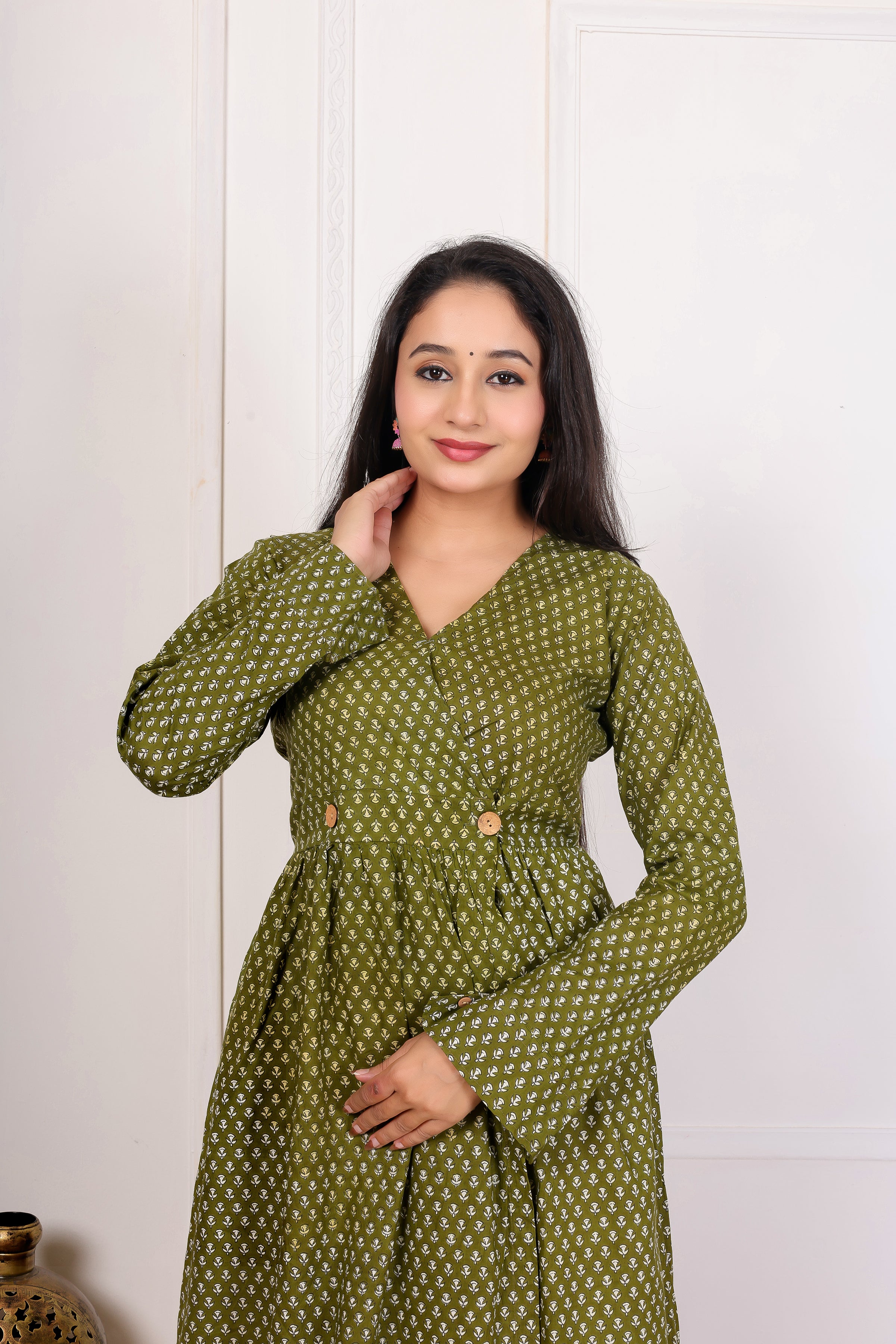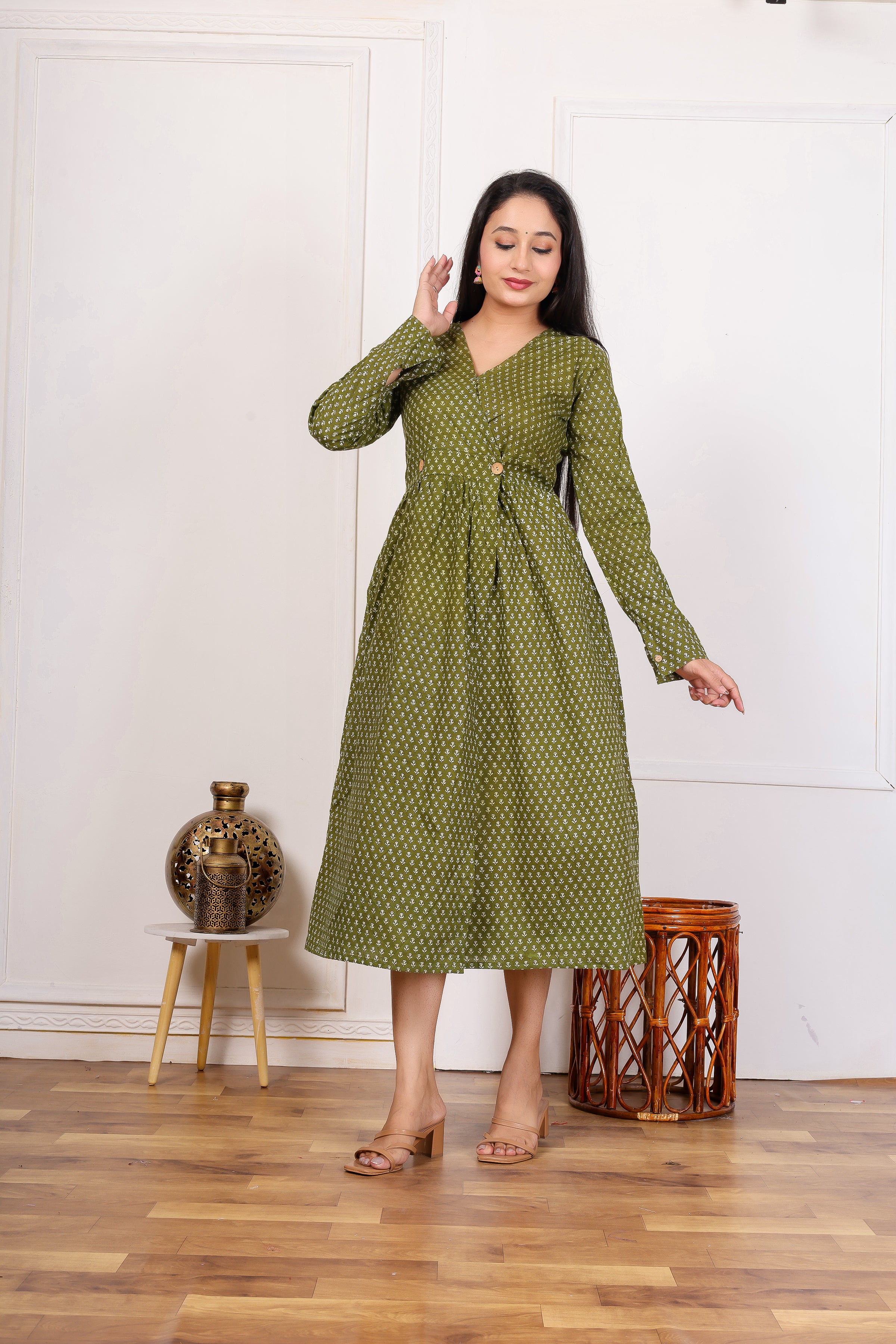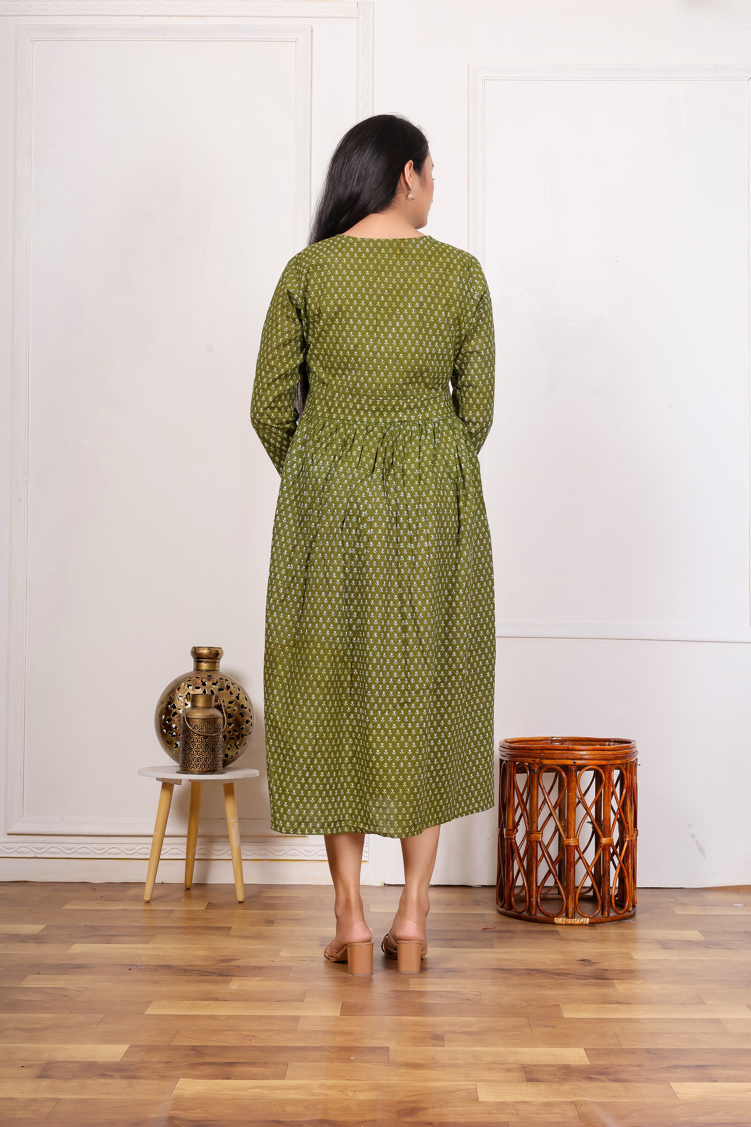 Embrace timeless charm with our Olive Green Printed Midi Dress, crafted to keep you stylish and comfortable all day long.