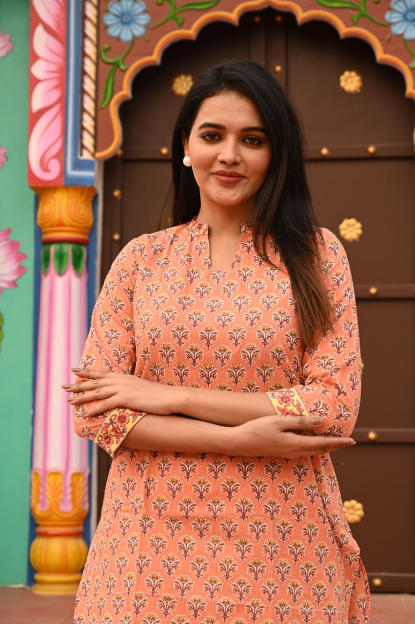 Bring a fresh pop of elegance to your wardrobe with this Peach Floral Printed Cotton Co-Ord Set, crafted for women who adore comfort with a touch of ethnic charm. The soft peach shade paired with dainty floral motifs makes it a perfect pick for both casual and semi-festive occasions.