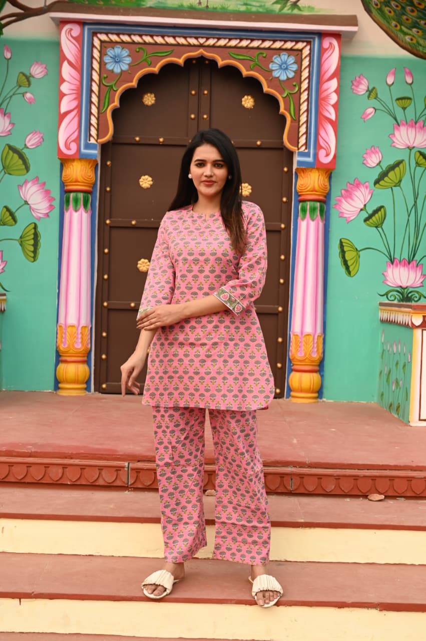 Bring a pop of color and elegance into your wardrobe with this pink floral gathered kurta co-ord set. Featuring a vibrant and playful design, the set includes a beautifully printed kurta adorned with delicate floral motifs in contrasting hues, perfect for a fresh and cheerful look. Crafted from soft, breathable fabric, this ensemble promises comfort while maintaining an effortlessly stylish appearance.