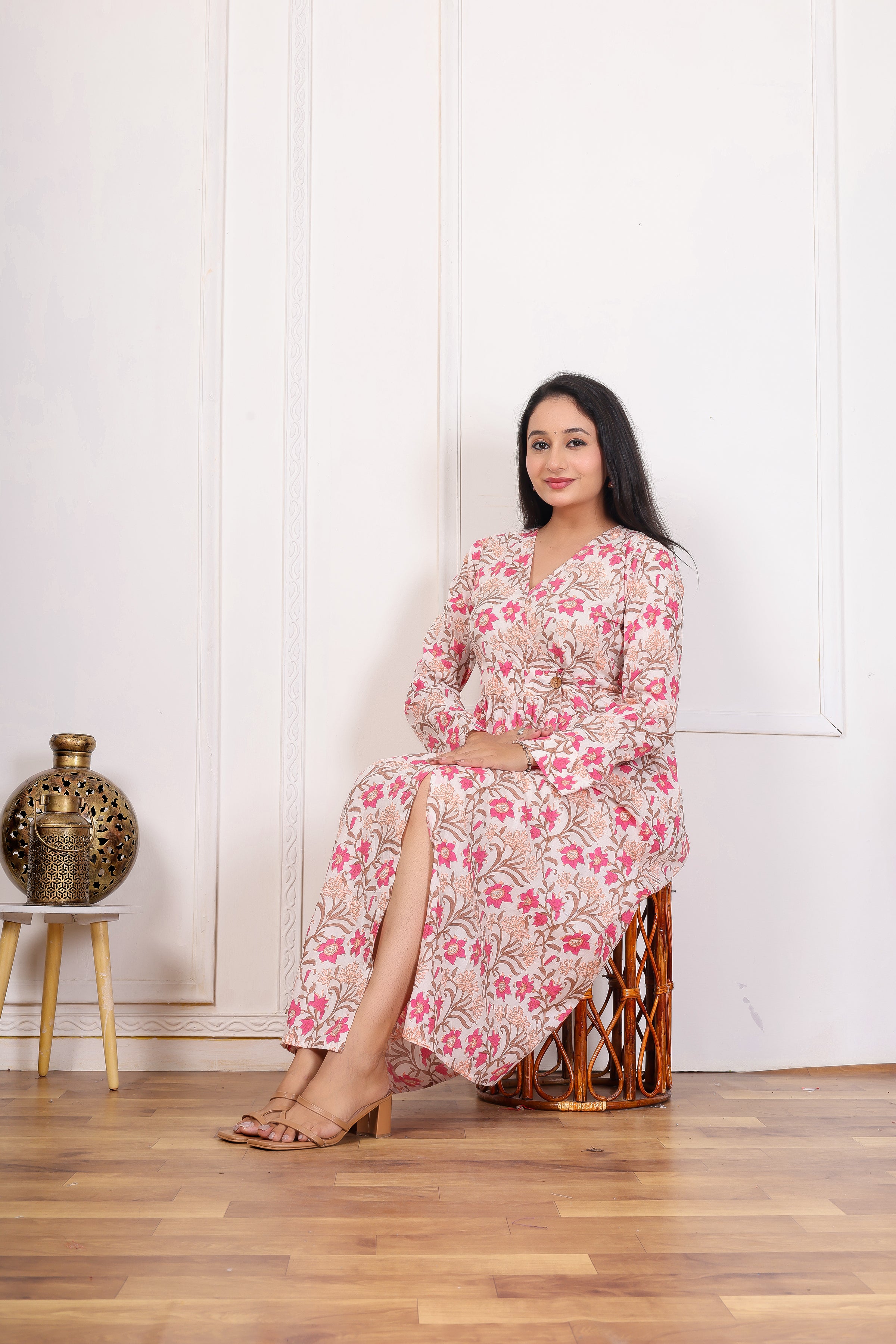 Add a splash of freshness and grace to your wardrobe with our Pink Floral Printed Midi Dress, designed to make you feel effortlessly stylish.