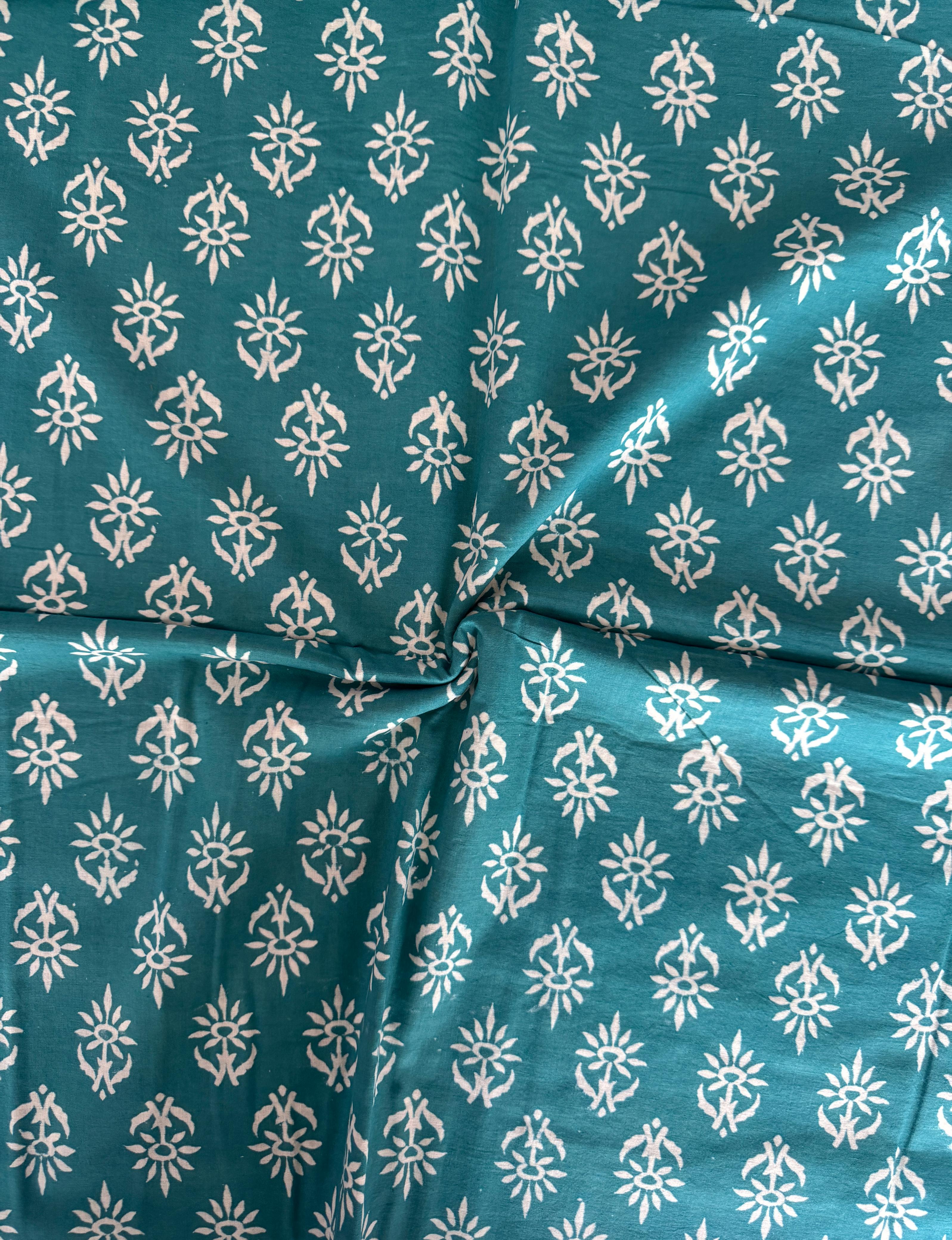Add a touch of elegance and tradition to your wardrobe or home with our Premium Handblock Printed Cotton Fabric. Crafted with care, this fabric features a beautiful teal blue base adorned with intricate white handblock motifs, perfect for creating stylish outfits or stunning home décor pieces.