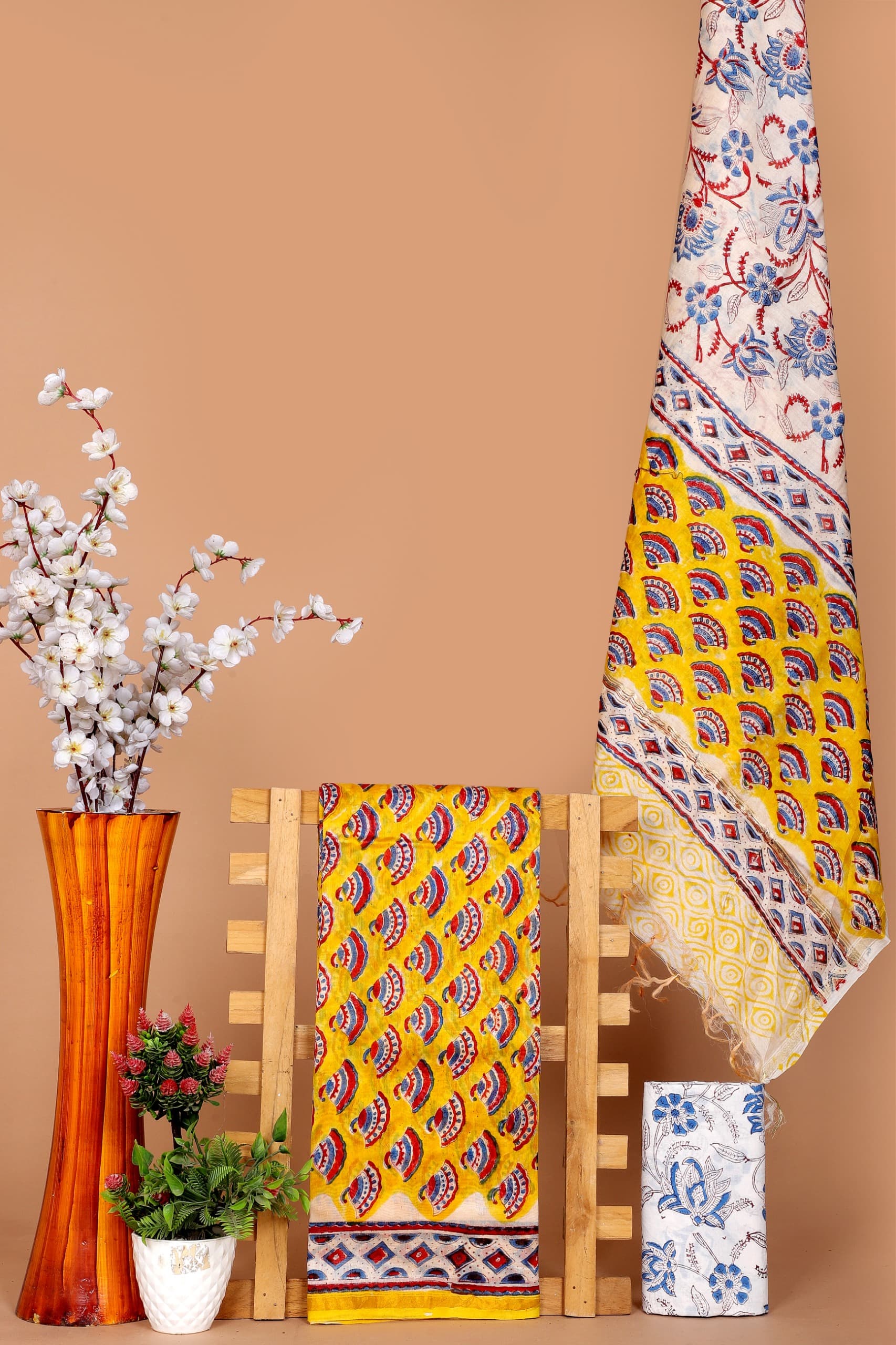 Infuse brightness and tradition into your wardrobe with this Radiant Yellow Chanderi Cotton Suit Set. A stunning ensemble that perfectly blends bold colors with ethnic charm — ideal for festive occasions and daytime functions.