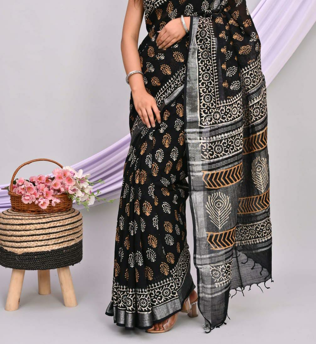 Make a bold statement with our Royal Black Handblock Printed Cotton Saree, a perfect blend of ethnic charm and contemporary elegance. Designed with traditional handblock motifs and highlighted with a beautifully patterned pallu, this saree is an artistic expression of India’s rich textile heritage.