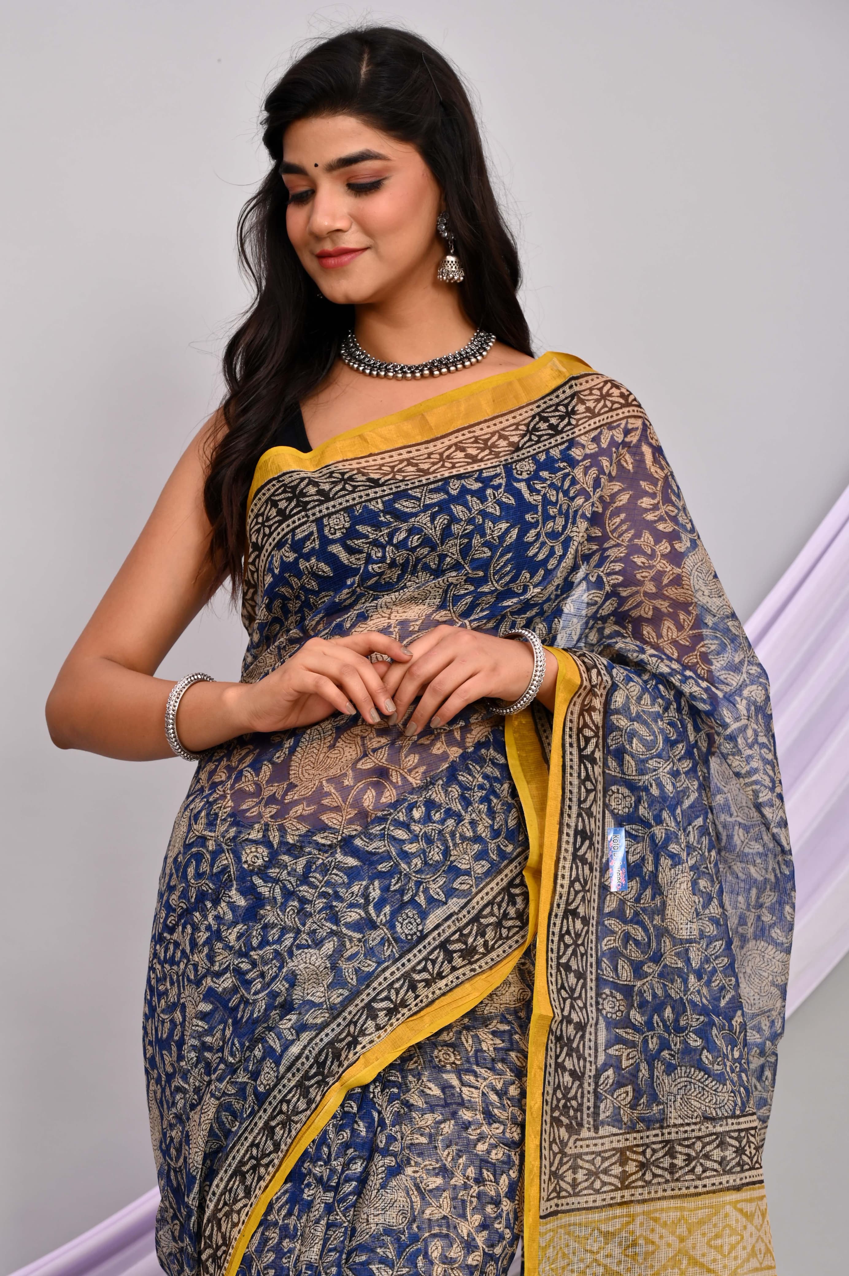 Grace meets craftsmanship in this stunning Royal Blue Kota Doria Saree, woven to perfection with intricate golden motifs and finished with an elegant yellow contrast zari border. This saree is a lightweight, breathable, and sheer delight that brings the richness of tradition into your modern wardrobe.