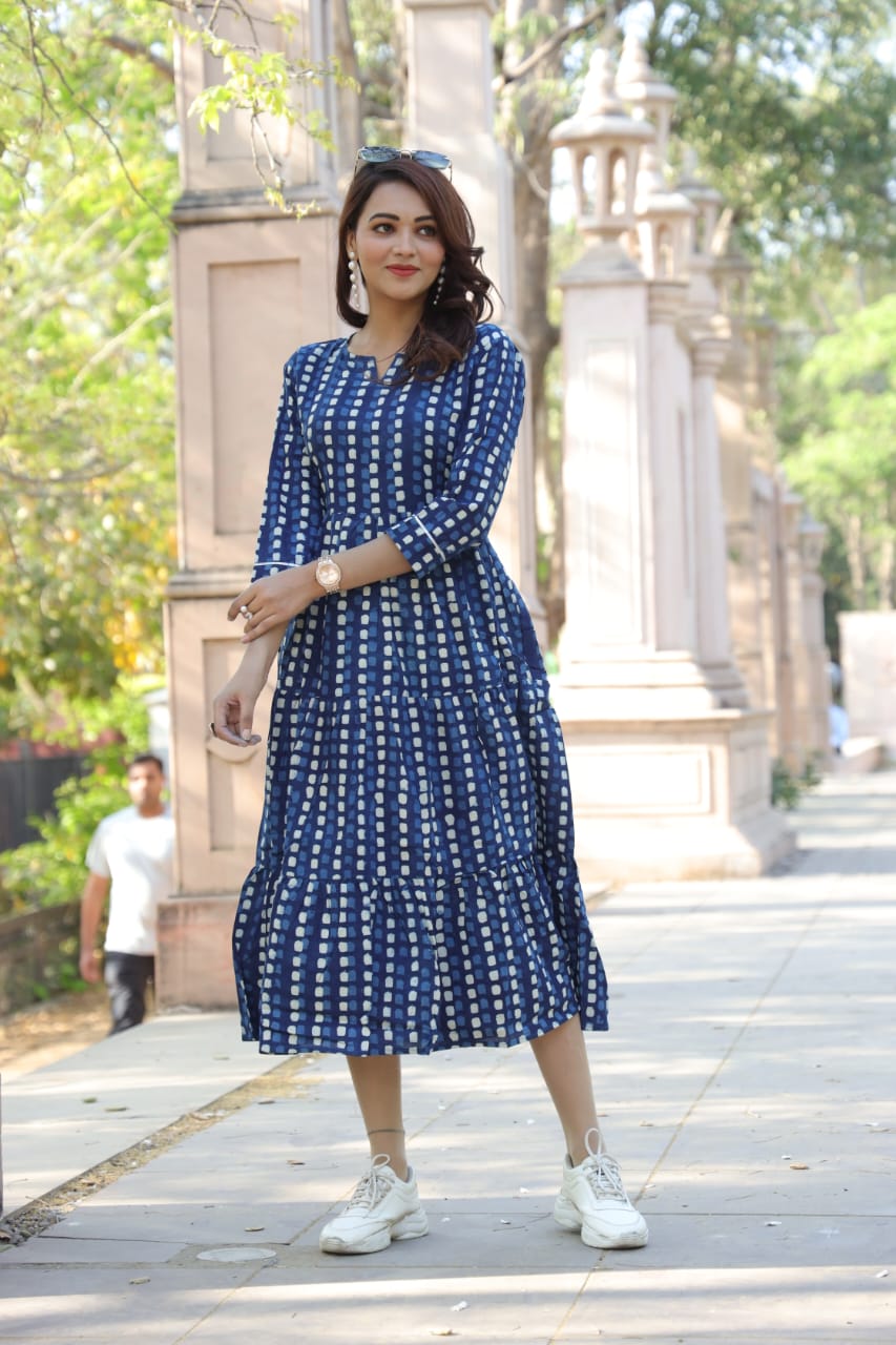 Elevate your wardrobe with this charming blue and white tiered dress. Perfect for a relaxed day out or a casual get-together, this dress combines comfort and elegance effortlessly. Crafted from a soft, breathable fabric, it ensures all-day comfort while giving you a chic, modern look.