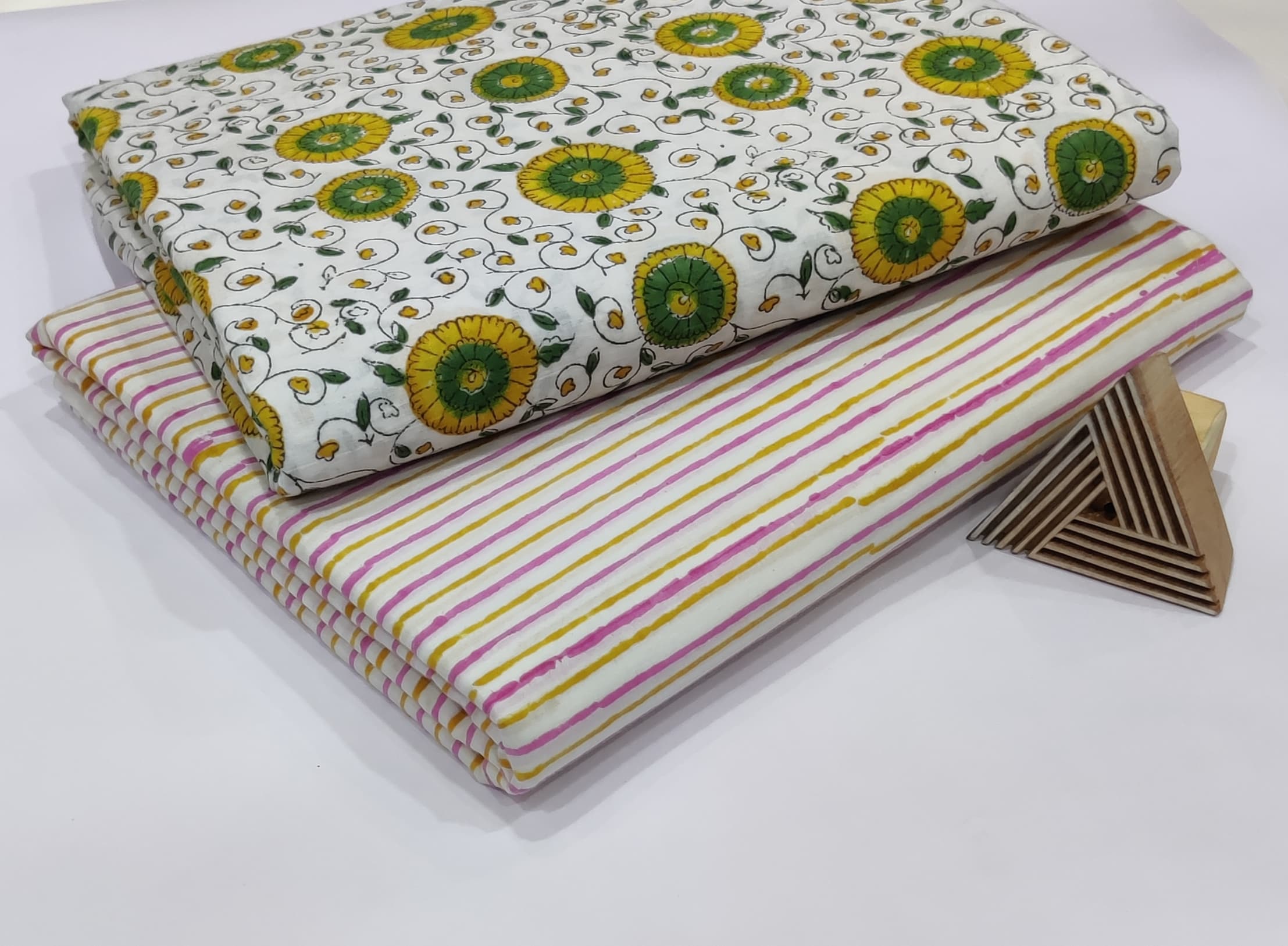 Bring a splash of sunshine to your ethnic wardrobe with this fresh white cotton fabric set, beautifully hand block printed with sunflower-inspired motifs and pastel stripes.