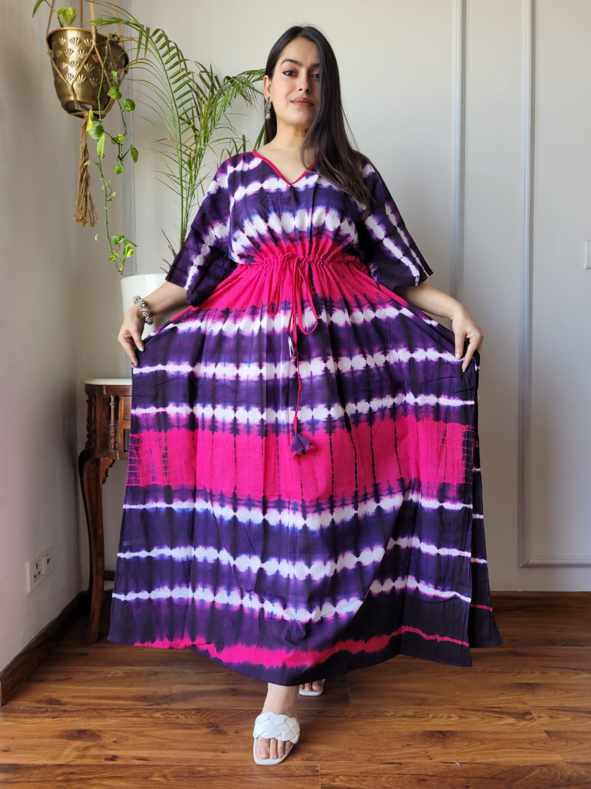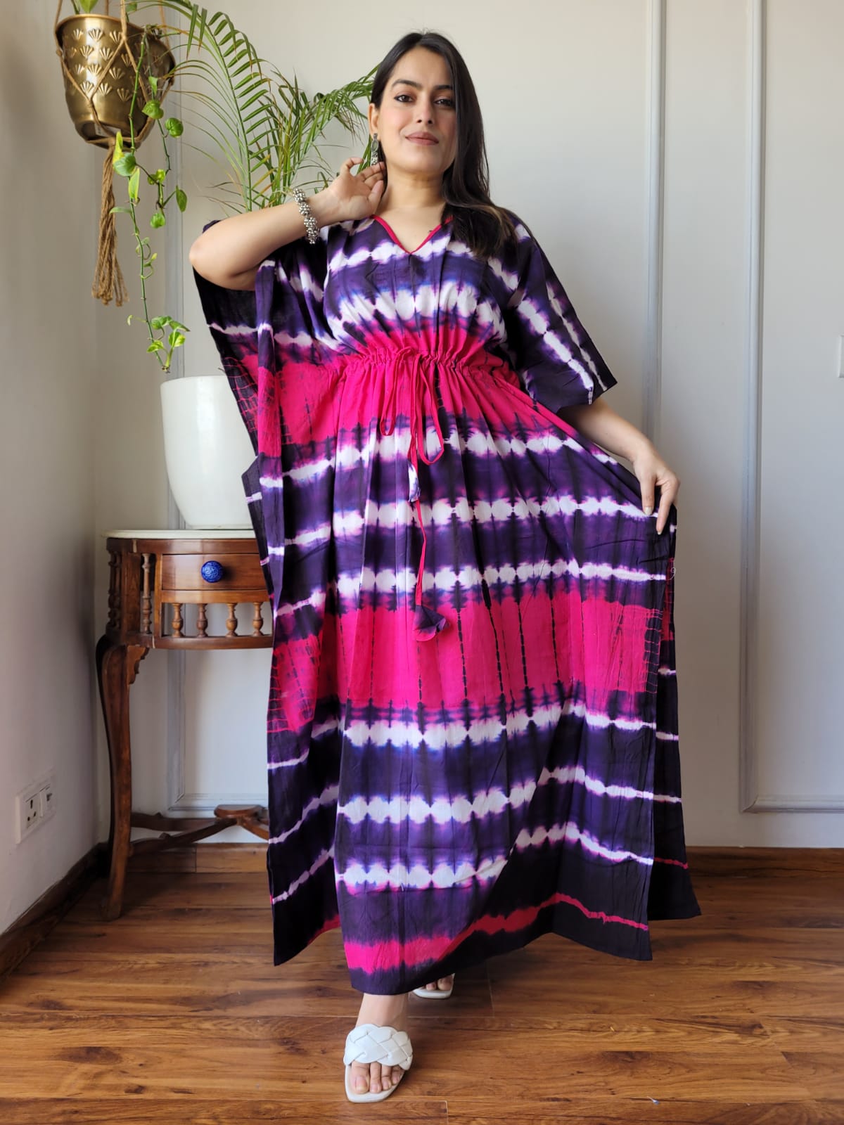 Turn heads with this Vibrant Pink & Purple Tie-Dye Kaftan – a perfect fusion of bold colors and ultimate comfort. Whether you're at home, on vacation, or out for a casual brunch, this kaftan lets you shine effortlessly.