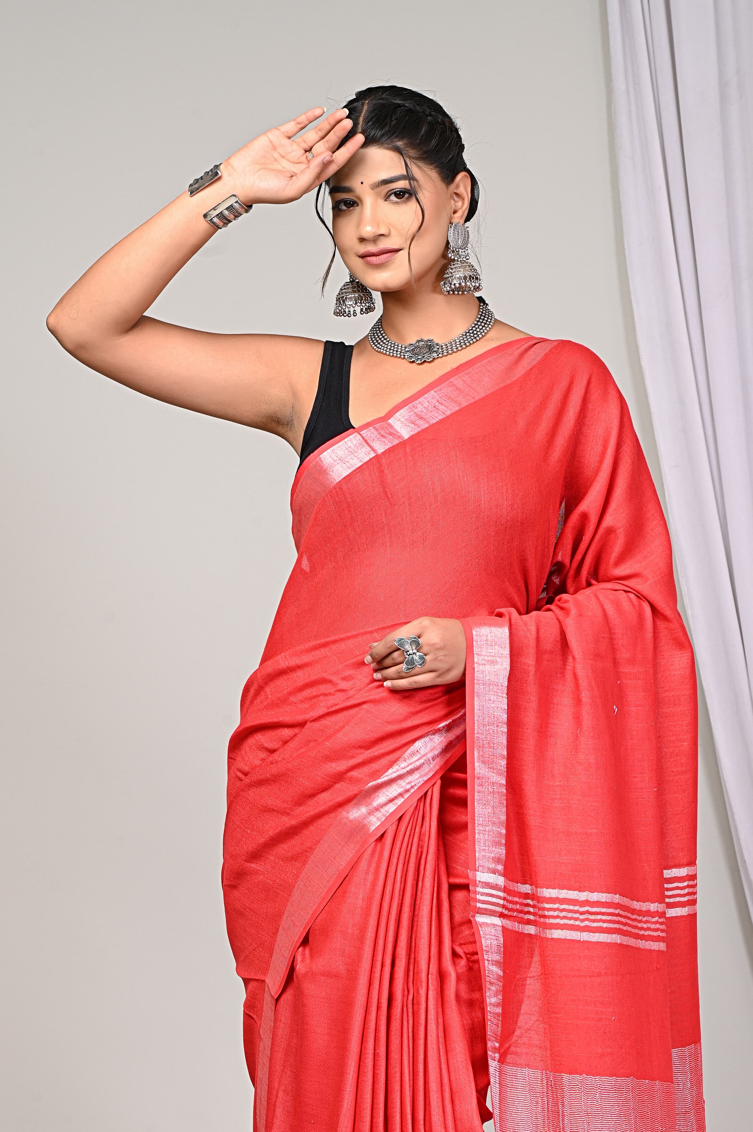 Make a bold and beautiful statement with this Scarlet Red Handloom Cotton Silk Saree, designed for the modern woman who cherishes tradition. The lustrous red hue is complemented by a soft silver zari border and minimalist striped pallu, making it perfect for festive occasions or elegant gatherings.