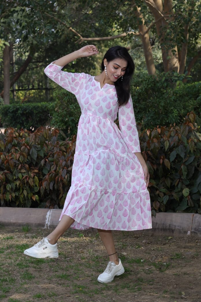 Fresh, graceful, and effortlessly stylish – this white cotton maxi dress with pink leaf prints is the perfect pick for your everyday chic look. Crafted from soft, breathable cotton fabric, it offers ultimate comfort while keeping you fashionable all day long. The fit-and-flare silhouette with tiered detailing adds a touch of elegance, making it ideal for both casual and semi-formal occasions..